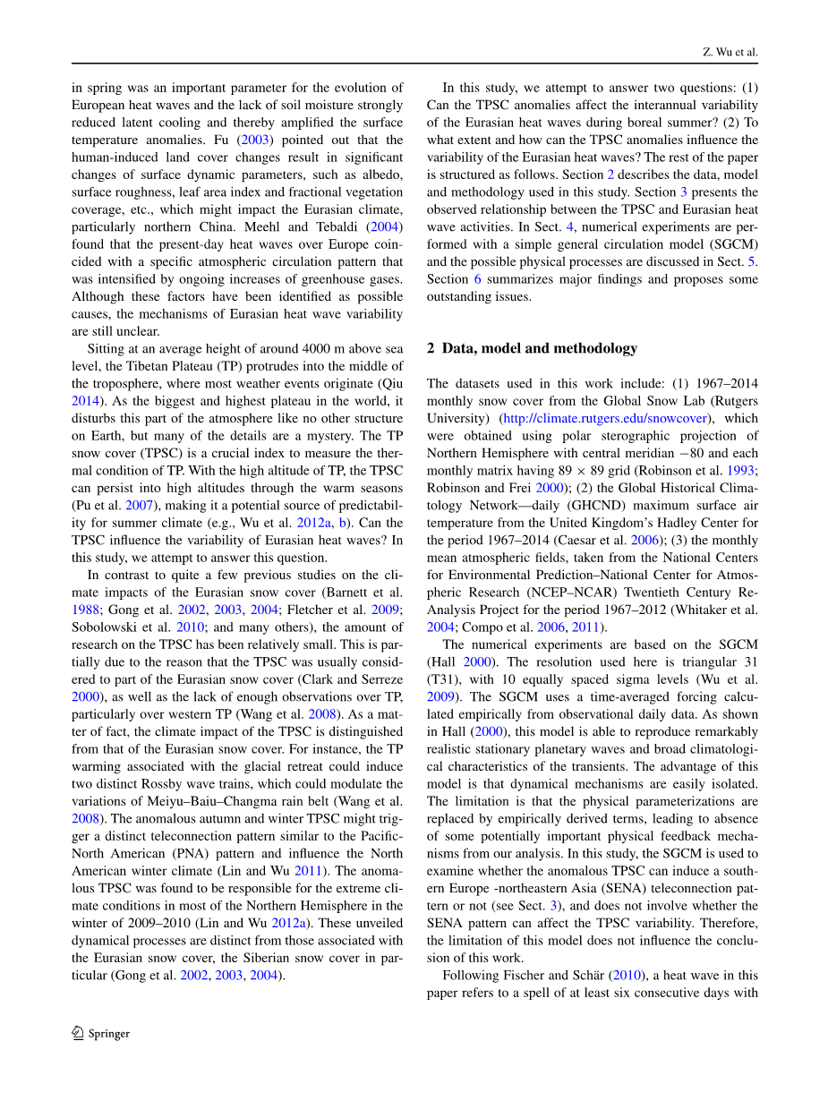 青藏高原(TP)4的海面平均高度在4000米左右,水平突入大部分天气事件起源——对流层中(邱 2014年)。作为世界上最大,海拔最高的高原,它对大气的扰乱与地球上其他结构大气不同,很多细节都是一个谜。TP的积雪(TPSC)是衡量TP的热状况的一个关键指标。在TP的高空中,TPSC能坚持到通过温暖的季节高海拔地区(2007年普等),使之成为夏季气候可预测的潜在来源(例如,Wu等人2012A,B)。在TPSC可以影响欧亚热浪的变化吗?在这项研究中,我们试图回答这个问题。
