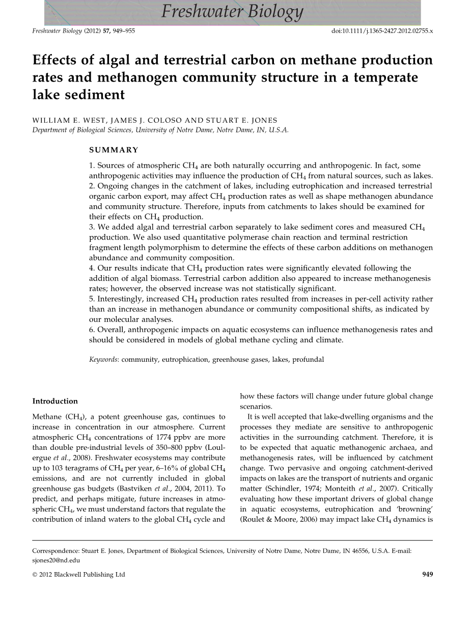 原文标题 Effects of algal and terrestrial carbon on methane production rates and methanogen community structure in a temperate lake sediment