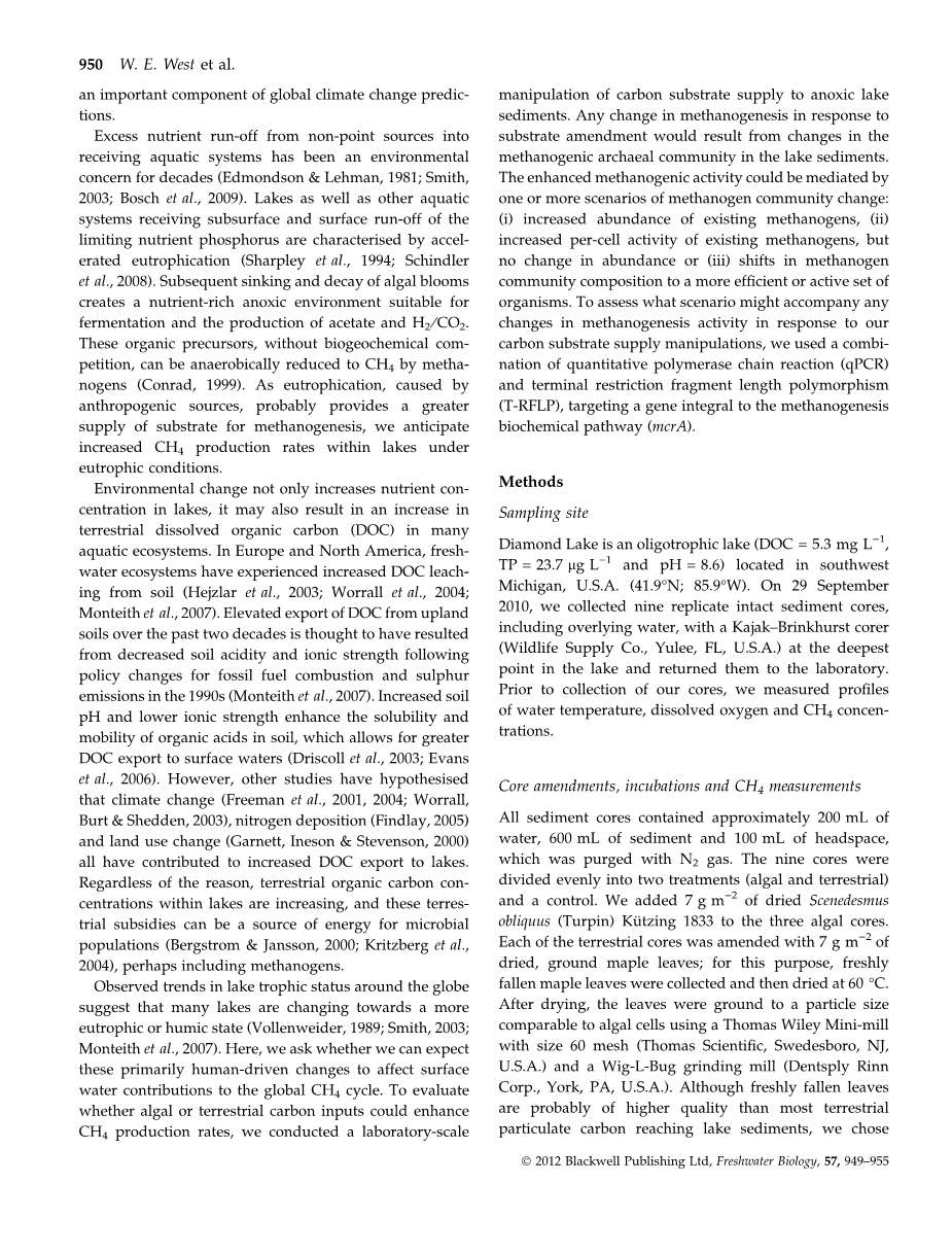 在全球湖泊营养状态观察到的趋势表明,许多湖泊朝着更富营养或腐殖酸状态改变(Vollenweider, 1989; Smith, 2003; Monteith 等., 2007). 在这里,我们是否预期这些主要是人类驱动的变化会影响到地表水对全球甲烷循环的贡献。为了评估藻类或陆地碳输入是否能提高甲烷的生产速率,我们进行了碳基板的实验模式处理来代替缺氧湖泊沉积物。针对基板修正案甲烷的任何变化是由湖泊沉积物中产甲烷古菌群落的变化所致。增强的甲烷生成活性可以通过产烷生物群落变化的一个或多个方案来介导:(i)现有产烷生物数量的增加,(ii) 现有产烷生物每个细菌的活性增加,但在数量没有变化,(iii) 产烷生物群落成分的变化组成一套更有效的或活跃的生物有机体。为了评估哪些情况可能伴随着甲烷活动的任何变化影响我们的碳基板供应处理,我们使用定量聚合酶链反应的组合(qPCR)和末端限制性片段长度多态性(T-RFLP) 来靶向 甲烷的生化途径中的基因。(mcrA)