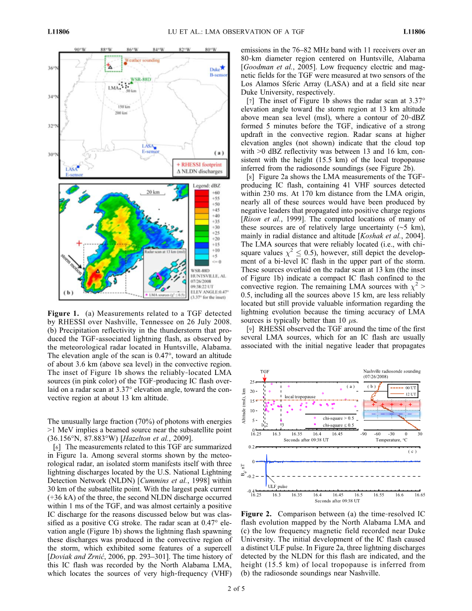 图一(a)给出了和TGF相关的测量结果,在气象雷达所探测的众多风暴中,存在一个美国闪电侦测网(NLDN)定位的孤立的风暴在子卫星的36km的探测范围内的过程中有明显三个闪电放电过程。三个放电过程中的最大值达到( 36KA)。第二次NLDN所探测到的闪电放电出现在TGF产生的1ms之内,在最初这种放电被划分为正地闪,但在随后可以通过多种理由能够确定其应该属于正云闪放电。扫描角为0.47°的雷达的扫描结果表明,产生这种放电的闪电形成于那些有超单体特征的风暴的对流区域。 北阿拉巴马州的闪电图(LMA)记录下了这种云闪的时间过程,LMA能够通过在范围达到直径达到80km的11个接收器在76-82Mhz的波段内定位超高频传输的来源。通过LASA的两个接受器以及杜克大学附近的观测场能够测量出TGF的低频电场以及磁场。