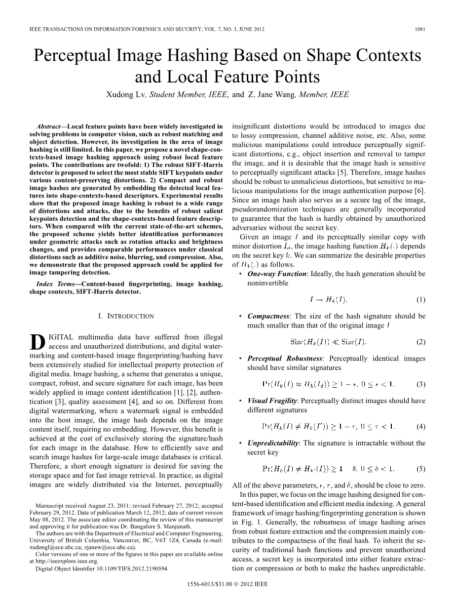 数字多媒体数据的非法访问和未经授权的分布,以及数字水印和基于内容的图像指纹/哈希已被广泛研究的数字媒体的知识产权保护。图像哈希,一个方案,生成一个独特的,紧凑的,强大的,和安全的签名,为每个图像,已被广泛应用于图像内容的识别,认证,质量评估等。不同于数字水印,其中一个水印信号被嵌入到宿主图像中,图像的哈希取决于图像内容本身,不需要嵌入。然而,这种好处是实现在数据库中的每个图像的签名/哈希的专门存储的成本。如何有效地存储和检索图像的哈希值的大型图像数据库是关键。因此,一个足够短的签名是希望节省存储空间和快速图像检索。在实践中,由于数字图像的广泛分布,通过互联网,感知微不足道的扭曲将介绍由于有损压缩的图像,信道的加性噪声,等一些恶意操作,可以引入感知显著扭曲,例如,对象的插入和删除,篡改的图像,这是可取的,图像是感知哈希重大袭击敏感。因此,图像的哈希值应该是非恶意的攻击鲁棒,但敏感的恶意操作的图像认证的目的。由于一个图像哈希也作为一个安全的图像标签,伪随机技术通常被合并,以保证不经授权的对手没有秘密密钥的哈希是难以获得的。