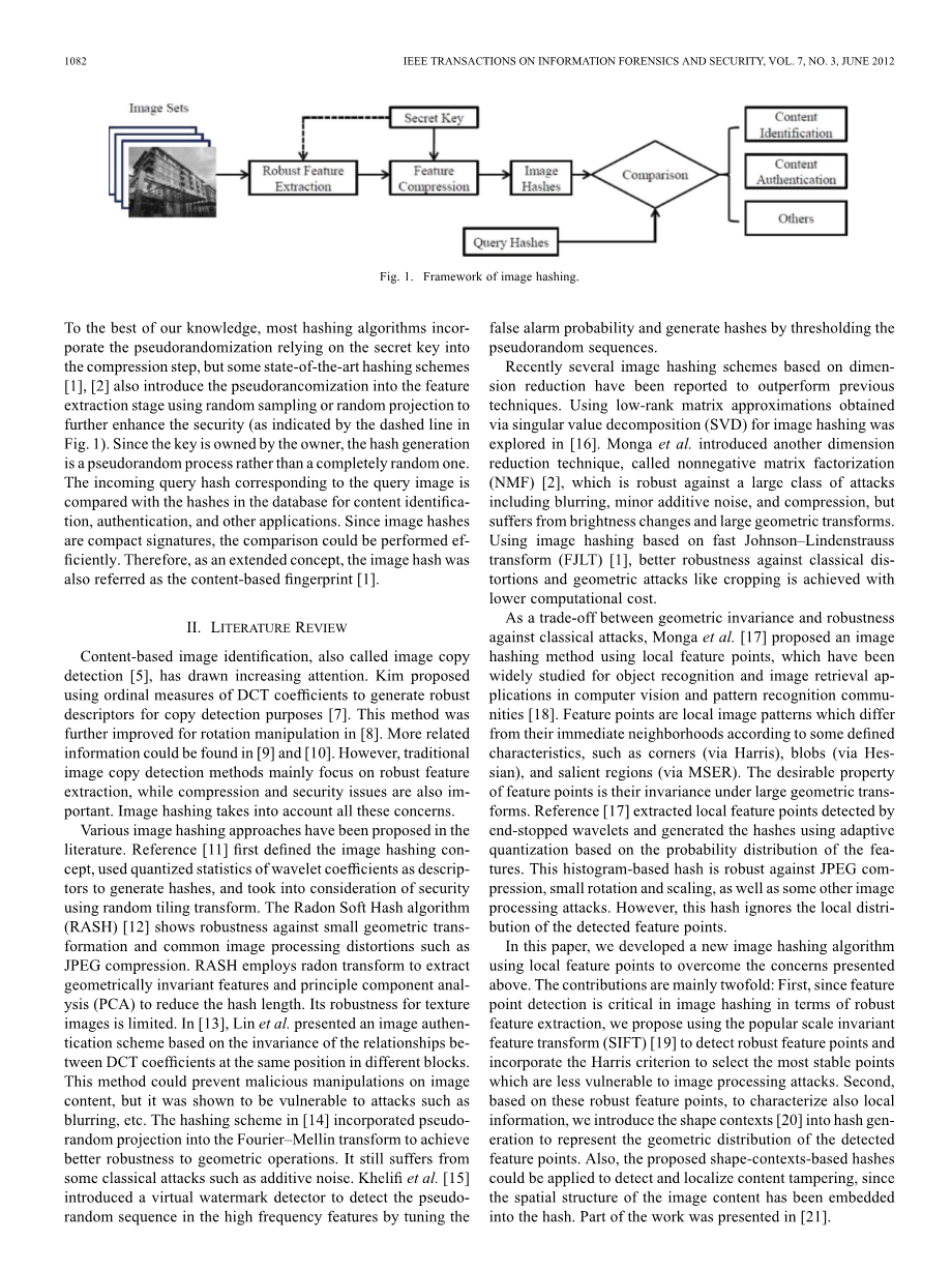 据我们所知,大多数的散列算法,将依靠密钥到压缩一步伪随机化,但一些国家的艺术-哈希方案,还介绍了伪随机性为特征提取阶段采用随机抽样或随机投影来进一步提高安全性(由虚线图1)。由于密钥是由业主所有,哈希生成伪随机过程而不是一个完全随机的。对应于查询图像传入查询哈希哈希值与在内容识别、数据库认证相比,和其他应用程序。由于图像哈希签名比较紧凑,可以有效地进行。因此,作为一个扩展的概念,图像哈希也被称为基于内容的指纹。