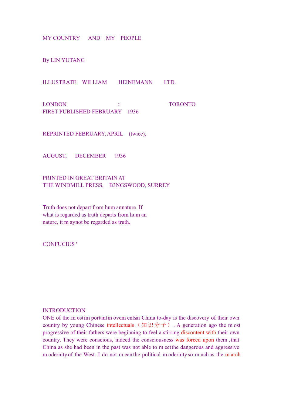 当一个外国人来到中国,他会情不自禁的产生很多感想。经常会同情中国,有时候也不免失望,但很少能真正的认识和理解中国,因为他们不是爱中国那就是恨中国了。也许对那些不住在中国的外国人来说,有时候会觉得中国是一个古老的大国,远离世界,似乎并不属于它。这种距离感却对他们有一种独特的的吸引力。但当一个人真正来到中国,就会被这个巨大的国度淹没,很快就停止思考了。他只是隐隐感觉到中国的存在,如此巨大,简直超过了人类心灵所能承受的程度。一切看起来杂乱无序但却似乎有章可循,遵循着自己的生存规律,生活就像是一出出雄伟的戏剧,时而悲哀,时而欢乐,但却总是那么的紧张,激烈和真实。在过一段时间之后,他又开始思考了,惊奇中又夹杂着惊愕。此时,他的反应就可能是很多样极端了。他的反应显示出他要么是一个浪漫的爱国主义者,要么是个一本正经,自命不凡的道学先生。他要么喜欢中国,要么不喜欢,并开始去证明自己的好恶。其实就是这样,人们总是要对中国有这样的看法,那样的见解,以此来彰显自己是个聪明人。我们苦苦寻求理由,又开始互相探讨趣闻轶事或者是生活中的琐事,转述别人说漏嘴或随便说的话,或者讨论一些重大的事情,以此来使自己成为哲学家。可以成为在中国问题上冷静的,铁面无私的批评家,认为中国一无是处。亦或是成为中国热情浪漫的歌颂者。当然,这些概括都是很愚蠢的。但是世界范围内人们的观点就是这么形成的,无可避免。之后我们便开始互相争论起来。一些人总是觉得他们对中国和中国人有着自己的真知灼见,他们便是统治世界的幸福的人,把商品从一地转移到另一地,他们总觉得自己是对的。另外一些人觉得对中国充满疑虑,困惑,一种敬畏之情,一种不知所措,或许是一种敬畏感和神秘感,他们又回到最初开始的地方了。但所有人都能感受到中国的存在,一种神秘莫测的“存在”。在当代,中国是最让人感到神奇和惊愕的事情了,但这不仅是因为她是世界上最古老的国家之一,或者是辽阔的疆域。她是当今世界上文化仍旧在持续的最古老的国家,她有着世界上最多的人口。曾几何时她也是最大的帝国,一个强大的征服者。她带给了世界其最重要的发明。她有着自己独特的文学,哲学和生活的智慧。当她在艺术领域中展翅飞翔之时,其他国家才刚刚学习拍打自己的翅膀。然而,如今的中国,无疑是当今世界上最混乱,最无序的国家,最令人可悲,最无助的国家,最没有能力振作起来稳步向前的国家。上帝——如果有上帝的话——本意是要让中国成为世界上最一流的国家,但她却在国联中选择了一个靠后的位子,与危地马拉坐在一起。整个国联已经尽了自己最大的努力,但却不能帮她把国家治理的井井有条;不能帮她阻止内战;不能帮助她,拯救她于自己国家的学者,军事家,革命家与绅士政客之手。