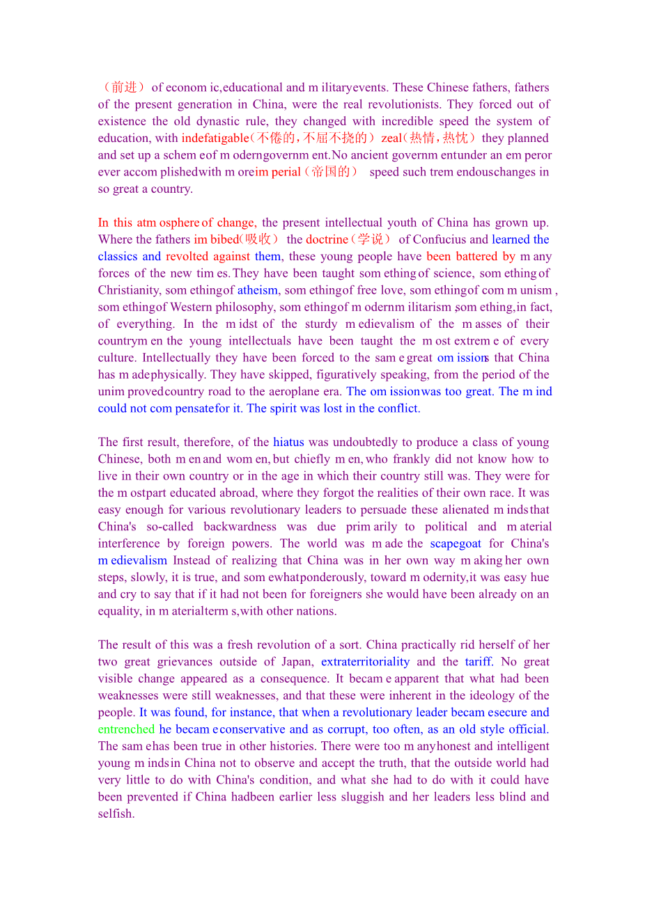 无论其他哪些方面中国做得不好,她有着一种优越的生存本能,一种新奇的,超自然的,非凡的活力。凭借着这种生存本能,使她能够适应经济,政治和社会的各种环境,而这些生活环境如果给予任何一个生命力不太旺盛的国家,那就是一场灾难了。她接受了大自然慷慨的赠送,将鲜花,小鸟,和名川大山作为其灵感和道德的支撑,单凭这一点就足以保证她的身心健全而纯洁,从而使整个民族免于城市社会的退化与堕落。她选择生活在狂野,晒晒太阳,享受落日的余晖,触摸清晨的甘露,吸收甘草和湿润大地的芳香。从她自己谱写的诗歌,生活的诗歌和真实写出来的诗歌中,她学会了如何恢复自己的能力。哎!太多的伤痛,受伤的灵魂。换句话来说,她已经想法设法使自己经历了如此漫长的岁月,就像人类努力生存下来一样,她尽可能的生活在野外,享受阳光和新鲜的空气。但她同样经历过艰辛的岁月,经历过持续百年的战争,经历过瘟疫,经历过自然灾害和暴政的折磨。所有这一切,她都用自己严酷的幽默和坚强的神经挺过来了。她总有办法使自己适应这一切。啊,漫长的历史啊,就仅仅是她能存活下来的这些漫长的年代就值得我们好好思索一番了。
