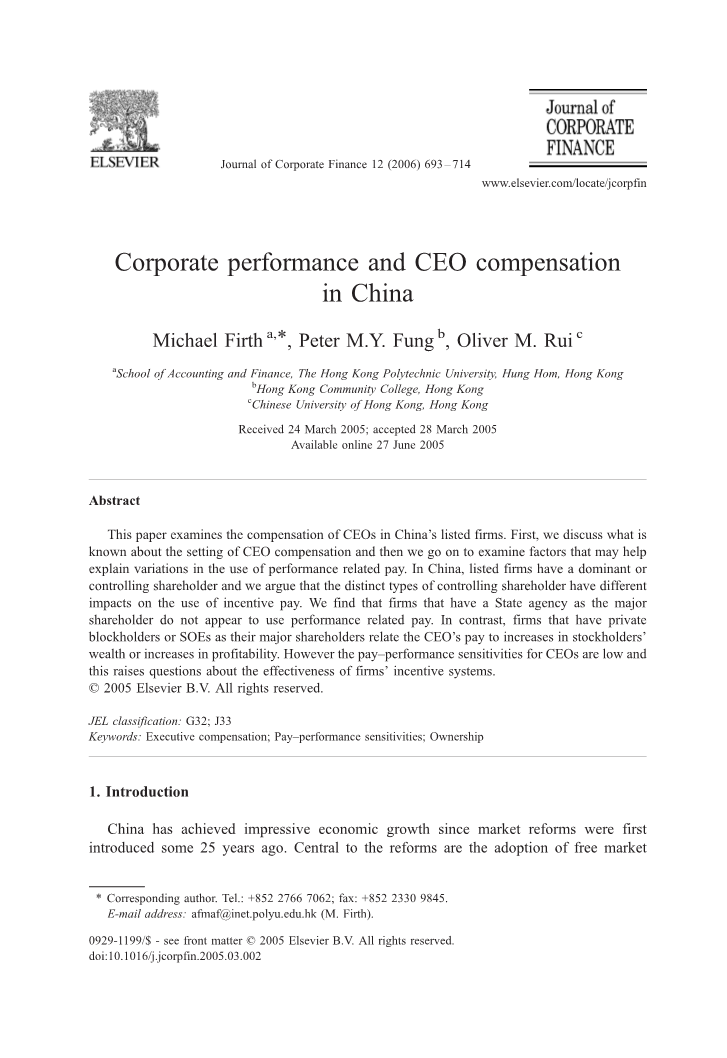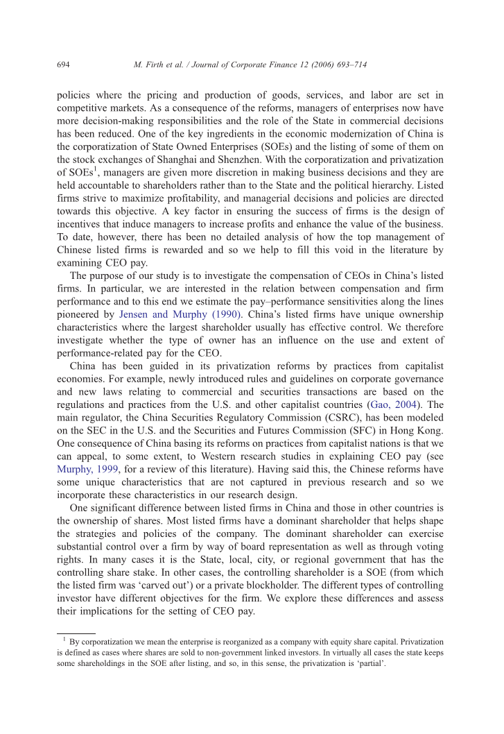 自25年前推出市场改革以来,中国取得了令人瞩目的经济增长。 改革的核心是采用自由市场在竞争激烈的市场中定价和生产货物,服务和劳动力的政策。 作为改革的结果,企业管理者现在有更多的决策责任,国家在商业决策中的作用已经减少。 中国经济现代化的一个关键要素是国有企业的公司化,以及其中一些在上海和深圳证券交易所的上市。 随着国有企业的公司化和私有化1,管理者在作出商业决策时有更多的自由裁量权,他们对股东负责,而不是对国家和政治等级负责。 上市公司努力实现利润最大化,管理决策和政策是针对这一目标的。 确保企业成功的关键因素是设计激励措施,促使管理人员增加利润并提高业务价值。 然而,迄今为止,还没有关于中国上市公司高层管理人员如何获得回报的详细分析,因此我们通过检查CEO薪酬来帮助填补文献中的空白。