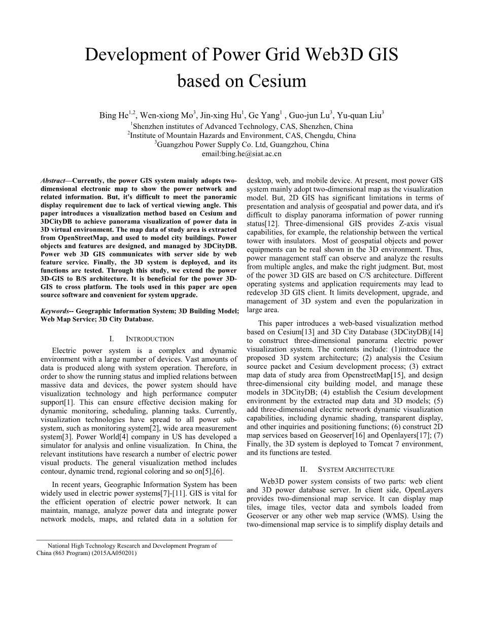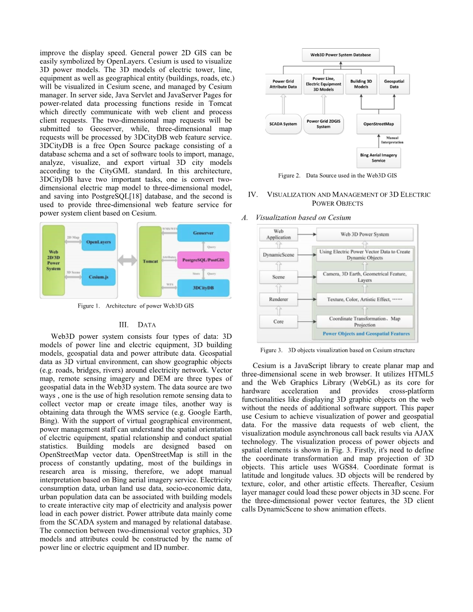 近些年来,地理信息系统已被广泛应用于电力系统。GIS对于电力网络的高效运行至关重要。它可以维护、管理、分析电力数据,并在桌面、web和移动设备的解决方案中集成电力网络模型、地图和相关数据。目前,大多数电力GIS系统主要采用二维地图作为可视化模型。但是,2D GIS在地理空间和电力数据的表示和分析方面有很大的局限性,很难显示出功率运行状态的全景信息。三维GIS提供了z轴视觉能力,例如,垂直塔与绝缘体之间的关系。大多数地理空间物体和动力设备可以真实地显示在3D环境中。因此,电力管理人员可以从多个角度观察和分析结果,并做出正确的判断。但是,大部分的3D GIS都是基于C/S架构的。不同的操作系统和应用程序需求可能会导致重新开发3D GIS客户端。它限制了3D系统的开发、升级和管理,甚至限制了大面积的普及。