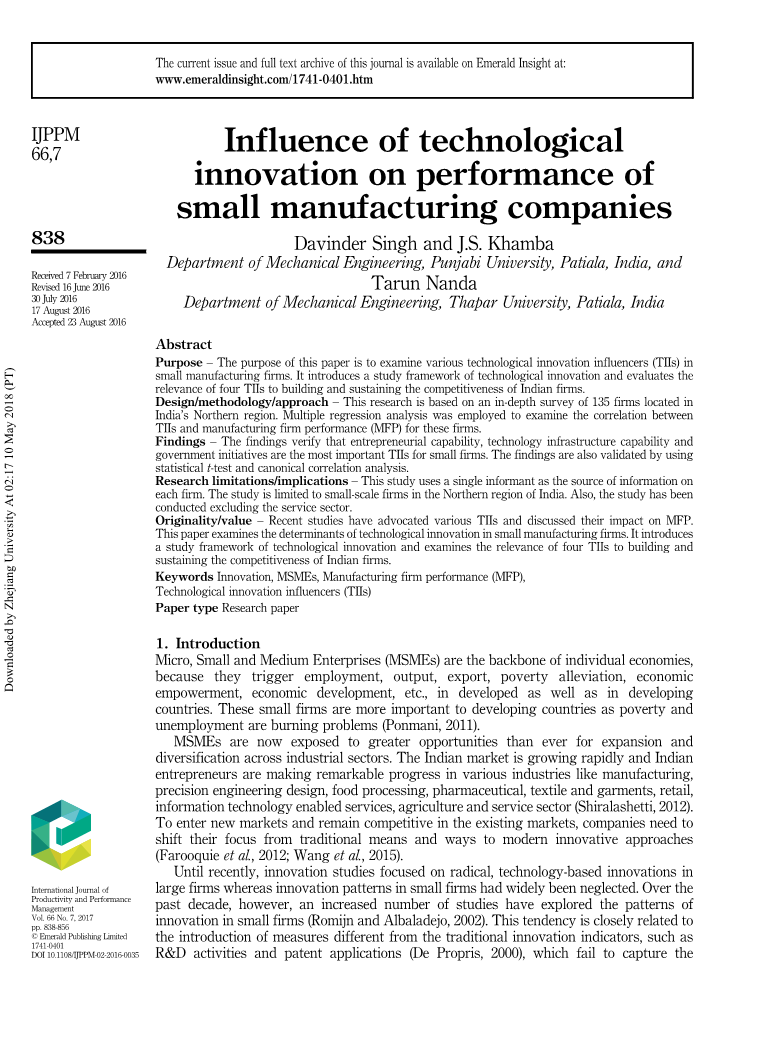 由于它们对经济的贡献和重要性,本文旨在验证技术创新影响因素(TII)与提高小型制造企业绩效相关的程度,小型制造企业通常被认为是在技术领域成熟度较低的企业(Sobanke等,2014)。目前大多数关于小企业创新的文献都通过案例研究来说明理论概念,但实证研究主要集中在大企业。关于小企业TII的实证依然很少,本文通过对印度小型企业的研究提供了对这些问题的见解。