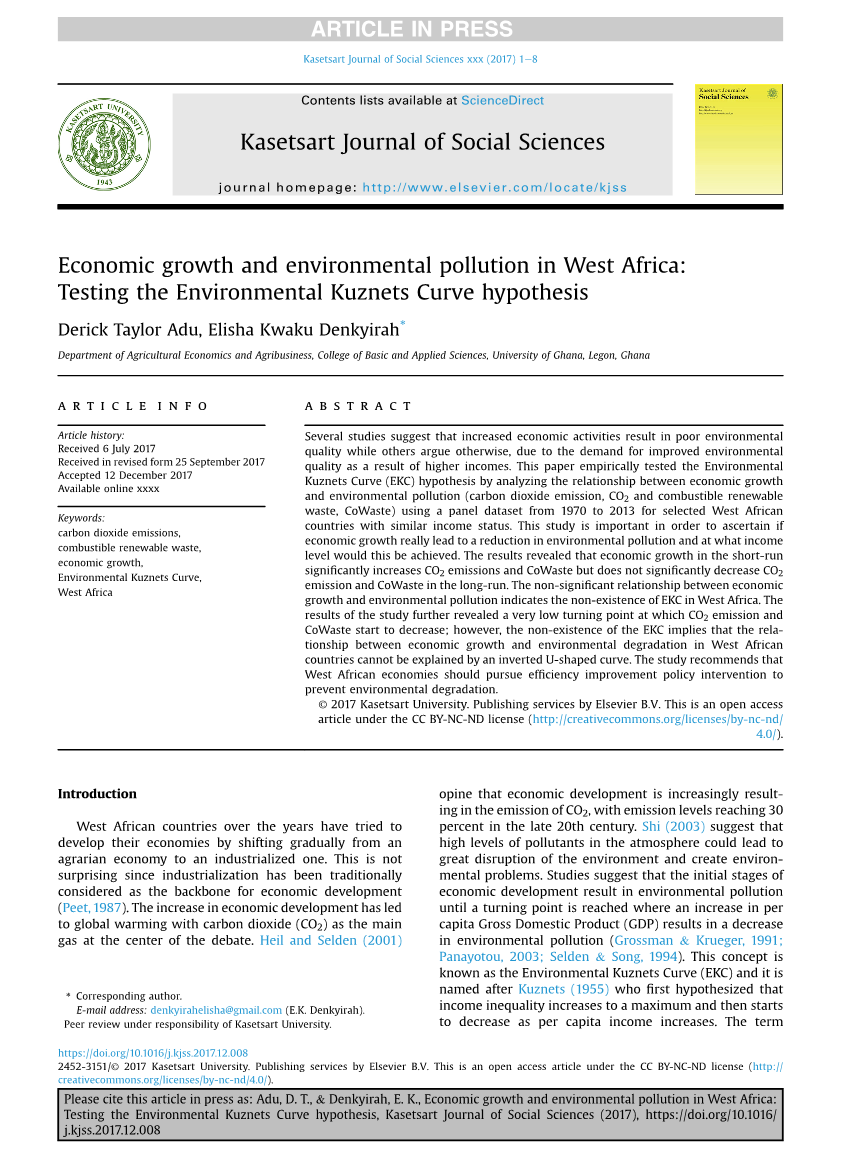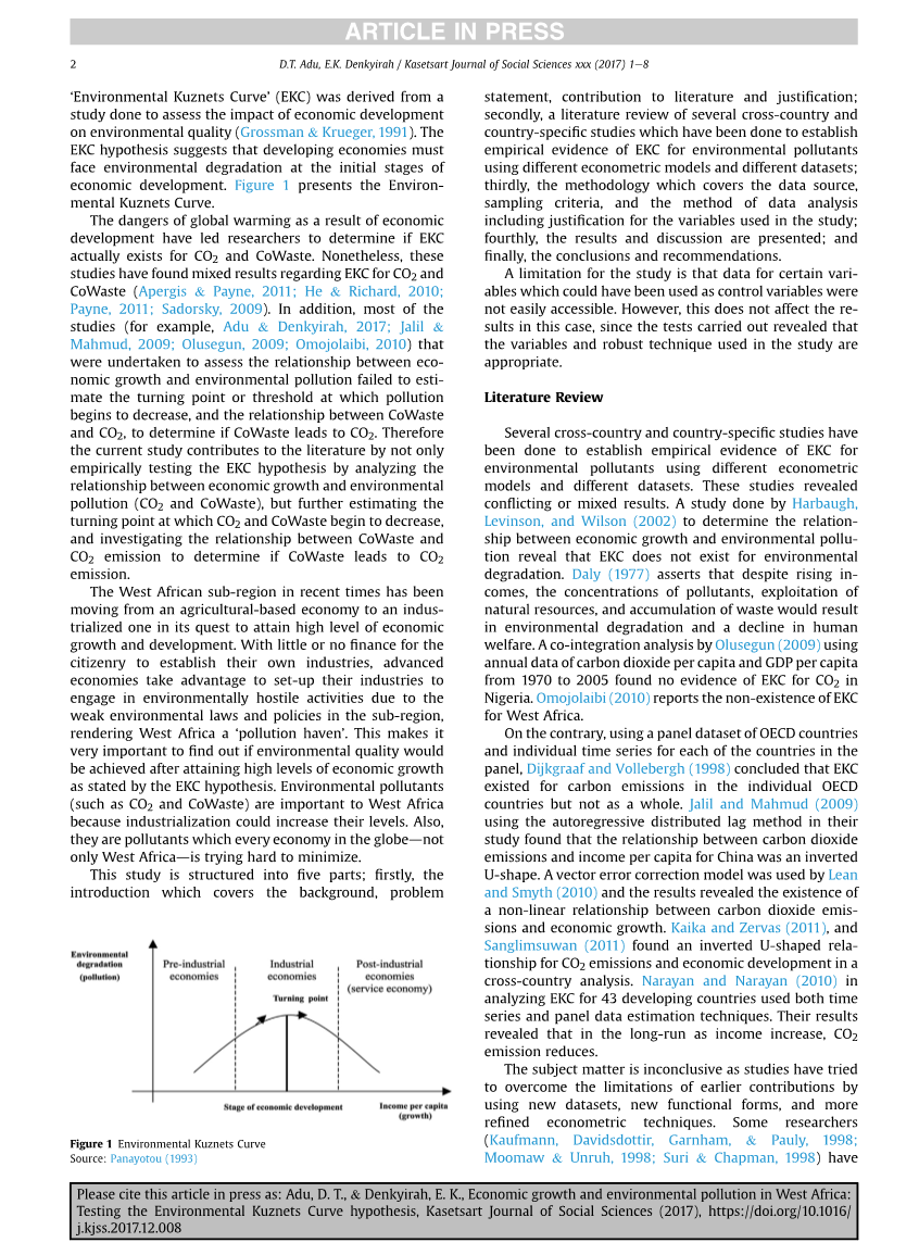 最近,西非次区域正在从以农业为基础的经济转向以工业为基础的经济,以实现经济的高速发展。但是由于该次区域几乎或根本没有资金来建立自己的产业,并且对于环境方面的法律和政策限制都十分薄弱,导致发达国家开始在这从事对环境不利的活动,从而使西非成为“污染天堂”。因此,如环境库兹涅茨曲线假设所述,在经济增长达到较高水平后,是否能够达到相应的环境质量水平,这是非常重要的。环境污染物(如二氧化碳和易燃可再生废物)对西非来说是很重要的,因为这反映了他们的工业经济的水平,而工业化可以提高他们的经济水平。此外,这些排放物在全球范围,不仅仅是西非,也是每一个经济体都在努力减少的污染物。
