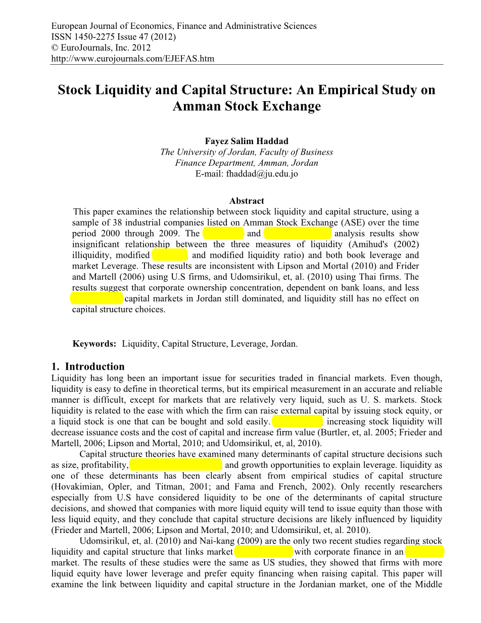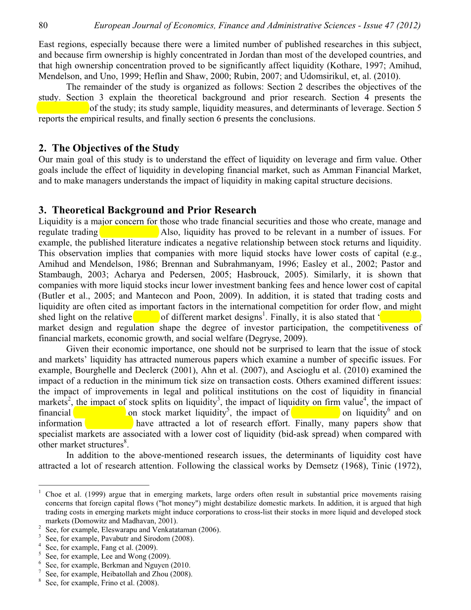 Udomsirikul等(2010)和Nai-kang(2009)的研究是近期关于股票流动性和资本结构的两项研究,它们将市场微观结构和新兴市场的公司融资联系起来。这些研究的结果和美国的研究结果相同,他们发现具有高流动性的企业杠杆率较低,并且在筹集资金时更倾向于股权融资。本文将研究中东地区之一的约旦市场里流动性与资本结构之间的联系,不仅是因为关于这个主题的已发表研究数量较少,还因为约旦相较于大多数的发达国家奇特所有权高度集中,并且高度集中的企业所有权被证明对流动性有着显著影响(Korthare,1997;Amihud,Mendelson,Uno,1999;Heflin和Shaw,2000;Rubin,2007;和Udomsirikul等,2010)。