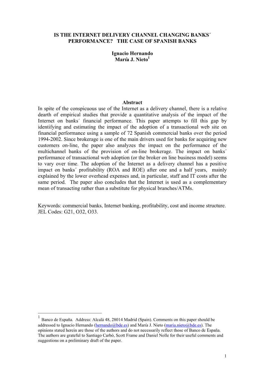 本文试图通过识别和估计互联网作为交付渠道对西班牙商业银行财务业绩的影响来填补这一空白。西班牙银行在采用交易网站方面并不是例外。此外,他们的采用策略符合目前全球多渠道(“点击和迫击炮”)方式的趋势。采用始于20世纪90年代末,到2002年,在西班牙运营的商业银行中有55%使用互联网作为分销渠道,主要用于货币转移,经纪和证券交易和存款。就本文而言,多渠道银行是那些使用传统分销渠道(即分支机构和ATM)以及电话和互联网的银行。因此,主要的互联网银行也包括在我们的样本中,因为它们使用传统的传送渠道,尽管程度较低。