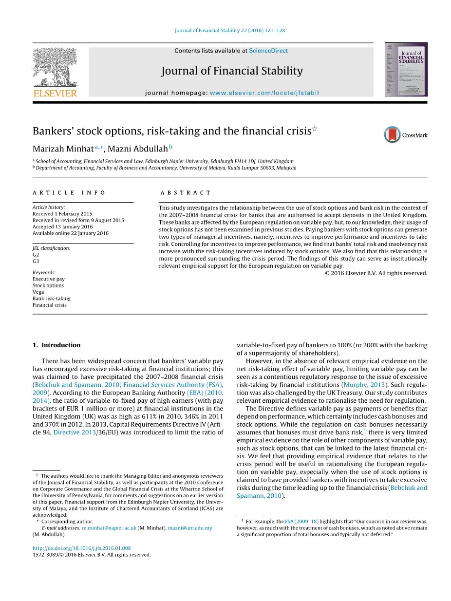 然而,由于缺乏关于可变薪酬净风险承担效应的相关经验证据,限制可变薪酬可被看作是对金融机构过度冒险问题的有争议的监管反应(Murphy,2013)。英国财政部也对这种监管提出了挑战。我们的研究提供了相关的经验证据来理顺监管需求。该指令将变动薪酬定义为取决于业绩的支付或收益,当然包括现金奖励和股票期权。虽然关于现金红利的规定必然假设奖金必须驱动银行风险1,但关于可变薪酬其他组成部分(如股票期权)的作用的经验证据非常有限,这可能与最新的金融危机有关。我们认为,提供与危机时期相关的经验证据将有助于理顺欧洲可变薪酬监管的情况,特别是在声称使用股票期权为银行家提供激励以在领先期间承担过度风险的情况下到金融危机(Bebchuk and Spamann,2010)。