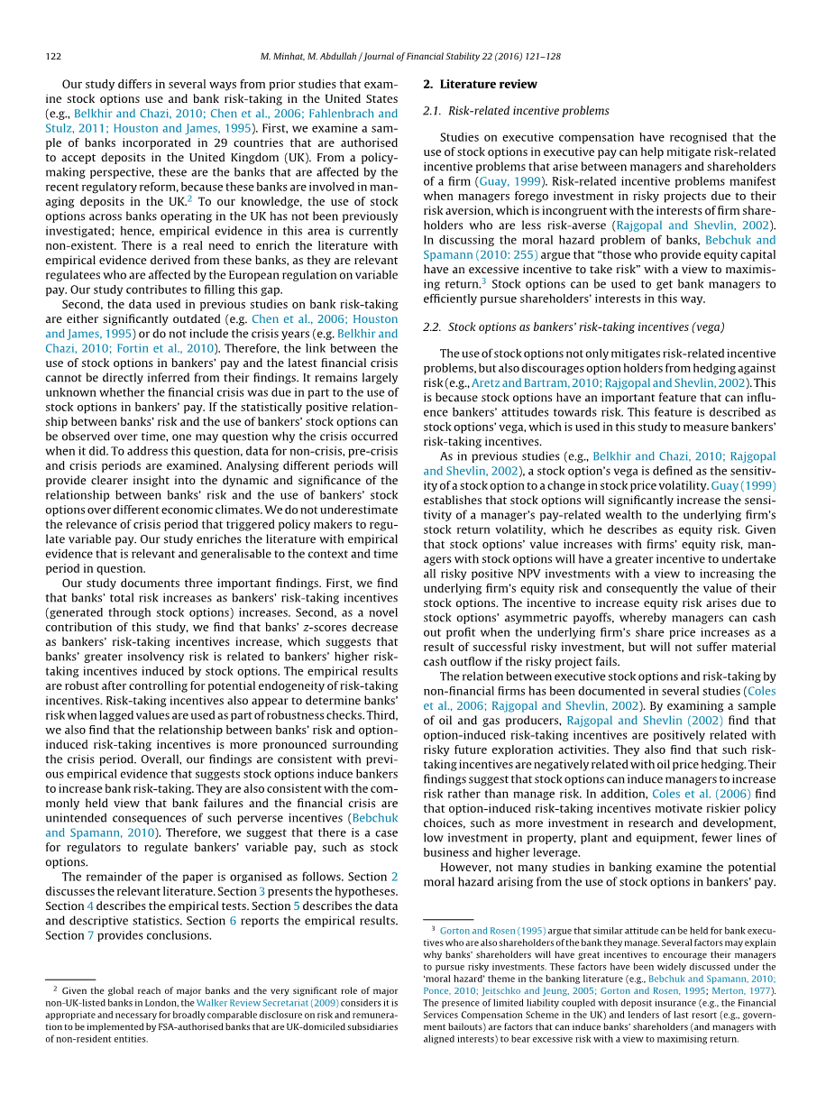 然而,银行业的研究并不多,所以研究银行家薪酬中使用股票期权所带来的潜在道德风险。尽管一些研究表明,银行管理人员可能有几个赞成银行投资风险增加的理由,股票的作用 没有提到选择(例如,Jeitschko和Jeung,2005; Gorton和Rosen,2002)。 也有人观察到,之前关于股票期权角色的实证研究结果有些复杂,并且与最新的金融危机没有直接联系(Fortin等,2010; Chen等,2006; Houston和James,1995)。