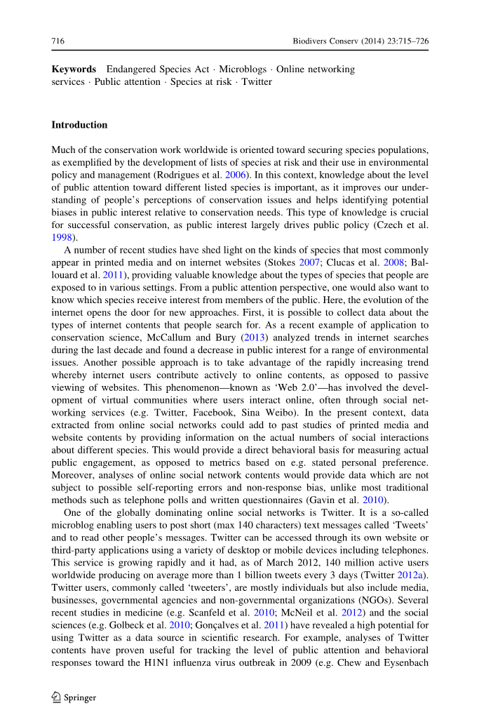 关键词:濒危物种法案,微博,在线网络服务,公众关注,危险物种,Twitter
