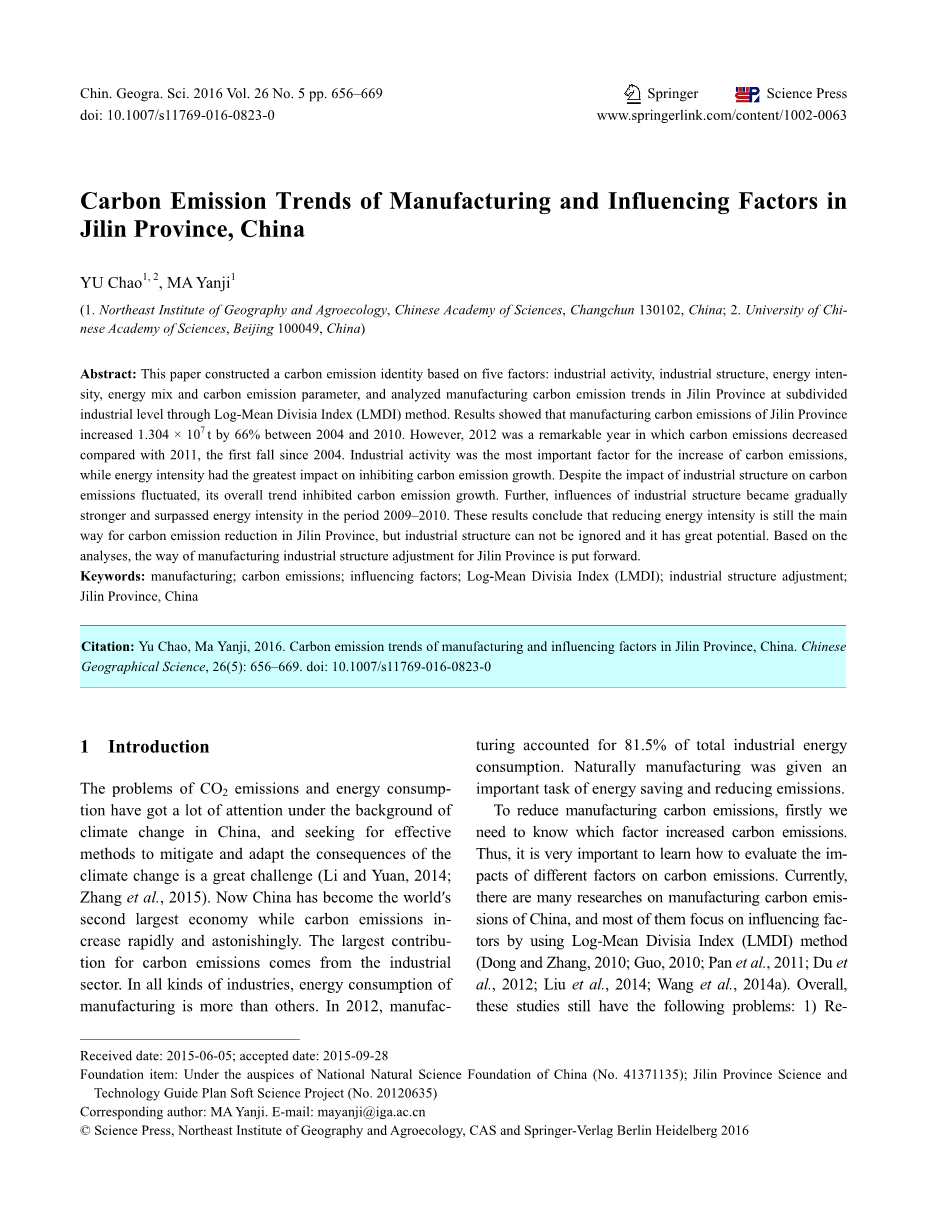 摘要:本文基于产业活动,产业结构,能源强度,能源结构和碳排放参数五个因素构建了碳排放标识,并在细分的吉林省工业化水平层级上通过Log-Mean Divisia指数分析了制造业碳排放趋势(LMDI)。结果显示,2004年至2010年吉林省的制造业碳排放量增长了1.304times; t,增幅达66%。然而,与2011年相比,2012年碳排放量明显下降,这是自2004年以来的首次下降。工业活动是碳排放增加最重要的因素,而能源强度对抑制碳排放增长影响最大。尽管产业结构对碳排放的影响存在波动,但总体趋势抑制了碳排放增长。此外,2009 - 2010年期间,产业结构的影响逐渐增强,超过了能源强度。结果表明,降低能源强度仍是吉林省碳减排的主要途径,但产业结构对碳减排的作用不容忽视,并且潜力巨大。基于这些分析,提出吉林省产业结构调整的路径。