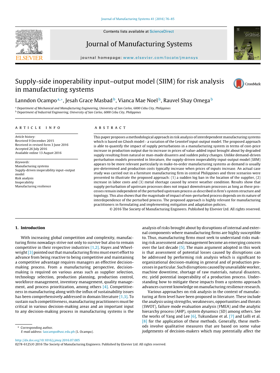 摘要:本文提出了一种基于Ghosh模型的相互依赖制造系统风险分析的方法方法,即Leontief投入产出模型的变化。拟议的方法能够量化生产系统中供应扰动对由于自然或人为灾害和突然的政策变化导致的供应下降导致的增值投入的价格增加造成的生产产出的影响。与文献中提出的需求驱动型扰动模型不同,由于需求通常是预先确定的,生产成本通常会随着投入价格的增加而增加,因此供给驱动的不可操作性投入产出模型(SIIM)似乎更具有相关性。在菲律宾中部的一家家具制造公司进行了一个实际的案例研究,并提出了三种方案来说明所提出的方法:(1)供应商所在地的突然的原木禁令,(2)劳动力成本的增加,以及恶劣天气造成的金属短缺。结果表明,上游工序的供给摄动不会影响下游工序,只要这些过程不受公司系统结构和拓扑结构的影响,就不会影响上游工序。这也表明,非摄动过程的影响程度取决于其对摄动过程的依赖性。在制定和实施缓解和适应政策方面,建议的方法与制造业从业者高度相关。