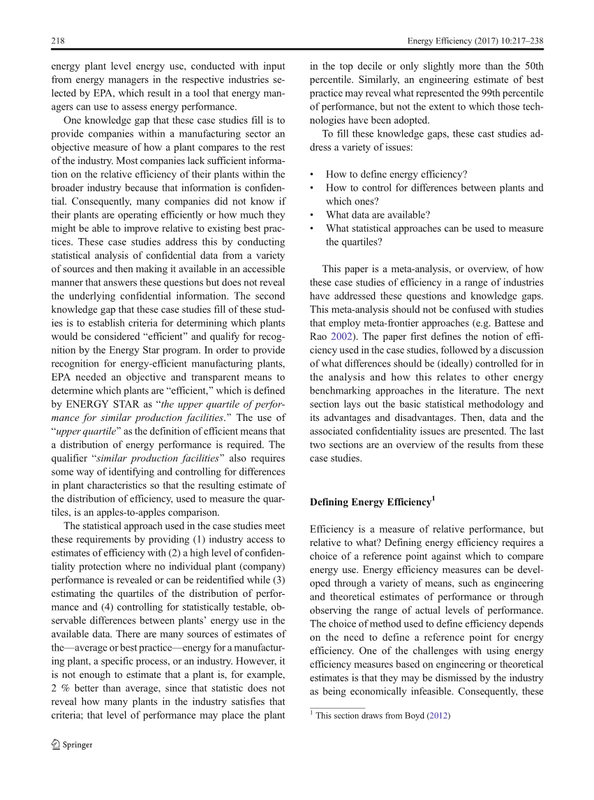 本文是一个元分析,或称概述,关于这一系列的行业效率案例研究如何解决了存在的问题和知识缺陷。这种元分析不应与共同前沿模型混淆(例如,Battese和Rao 2002)。本文首先定义了案例研究中使用的效率概念,接着讨论了在分析中应该控制哪些差异(理想情况下),以及这与文献中的其他能源基准测试方法如何相联系。下一节将阐述基本统计方法及其优缺点。然后,展示数据和相关的保密事宜。最后两部分是这些案例研究结果的概述。
