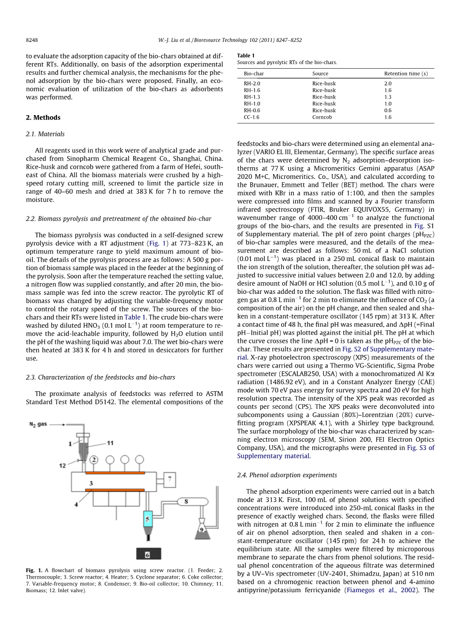 生物质热解在一个自行设计的螺旋热解装置与恒温时间调整调整器中进行。(图1)为了产生最大量的生物油,实验在773 - 823 K,这个最佳的温度范围内进行。热解过程的细节如下:在热解开始时,在进料器放置500克的生物质样品。温度达到设定值后,氮气流量不断提供,20 min后,生物质样品送入螺杆反应器。通过调整变频电机来控制螺杆转速,从而改变了生物质的热解RT。生物碳和RTS来源列于表1。在常温下用稀HNO3洗涤粗生物炭(0.1 mol/L)以清除酸浸杂质,然后用水淋洗到pH值在7左右。湿生物质炭在干燥器中进行加热至383 K恒温4小时。