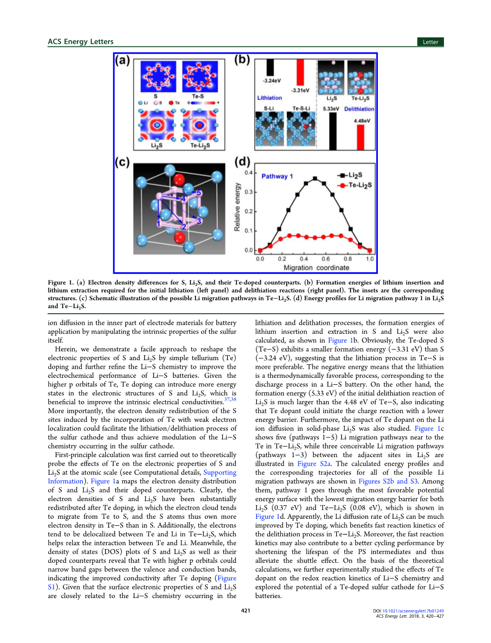 图1所示。(a) S、Li2S和它们的Te-doped对应的电子密度差。(b)初始化锂(左面板)和退硫反应(右面板)所需的锂插入和锂提取的形成能量。insets是相应的结构。(c) Te Li2S中可能的Li迁移路径示意图。(d) Li2S和Te Li2S的Li迁移途径1的能量分布图。