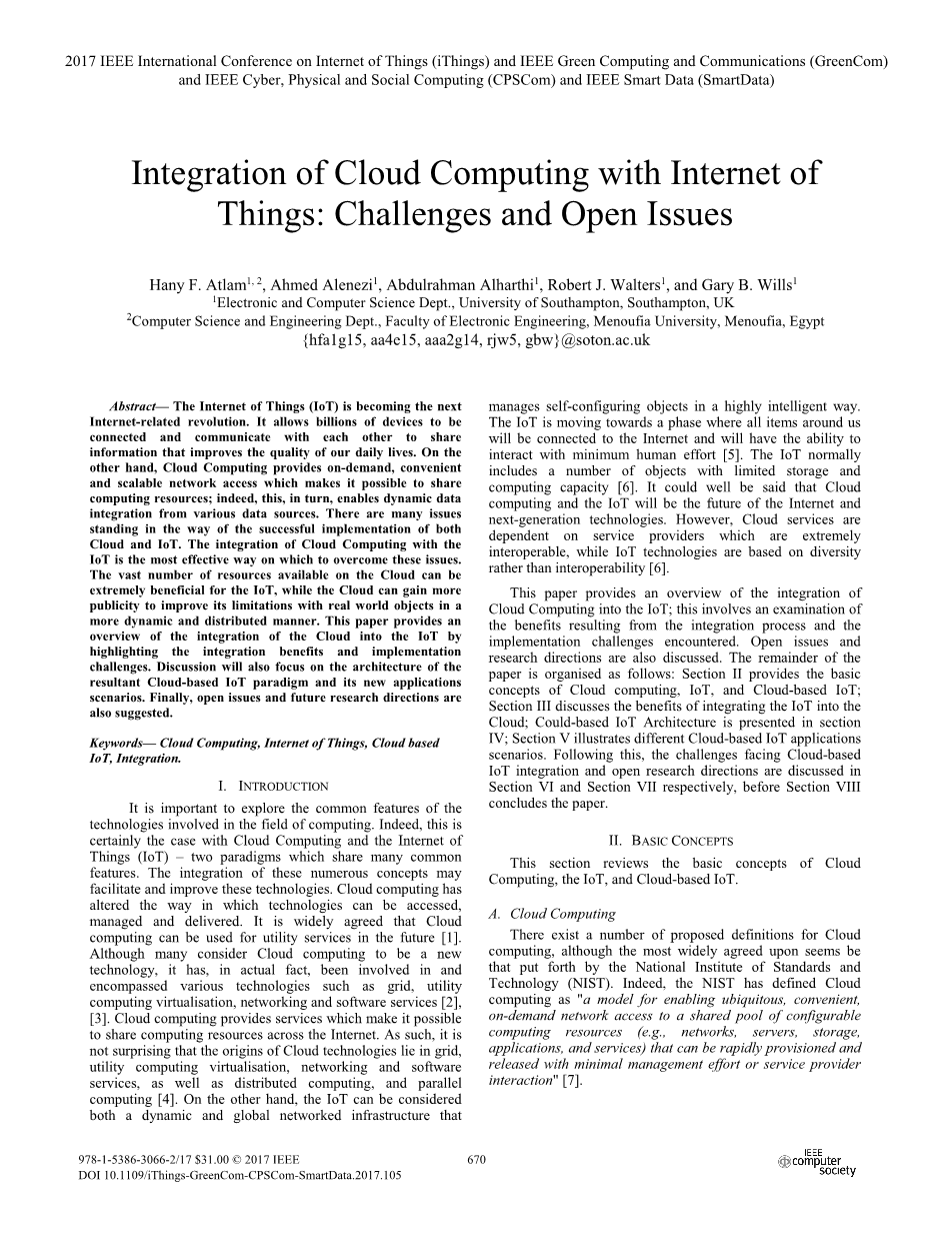 本文概述了将云计算集成到物联网中的情况;这包括研究集成过程带来的好处和遇到的实现挑战。还讨论了有待解决的问题和研究方向。本文的其余部分组织如下:第二节提供了云计算、物联网和基于云的物联网的基本概念;第三节讨论了将物联网集成到云中的好处;第四节介绍了基于可能的物联网架构;第五节说明了不同的基于云的物联网应用场景。随后,在第八节结束之前,分别在第六节和第七节讨论了基于云的物联网集成和开放研究方向所面临的挑战。