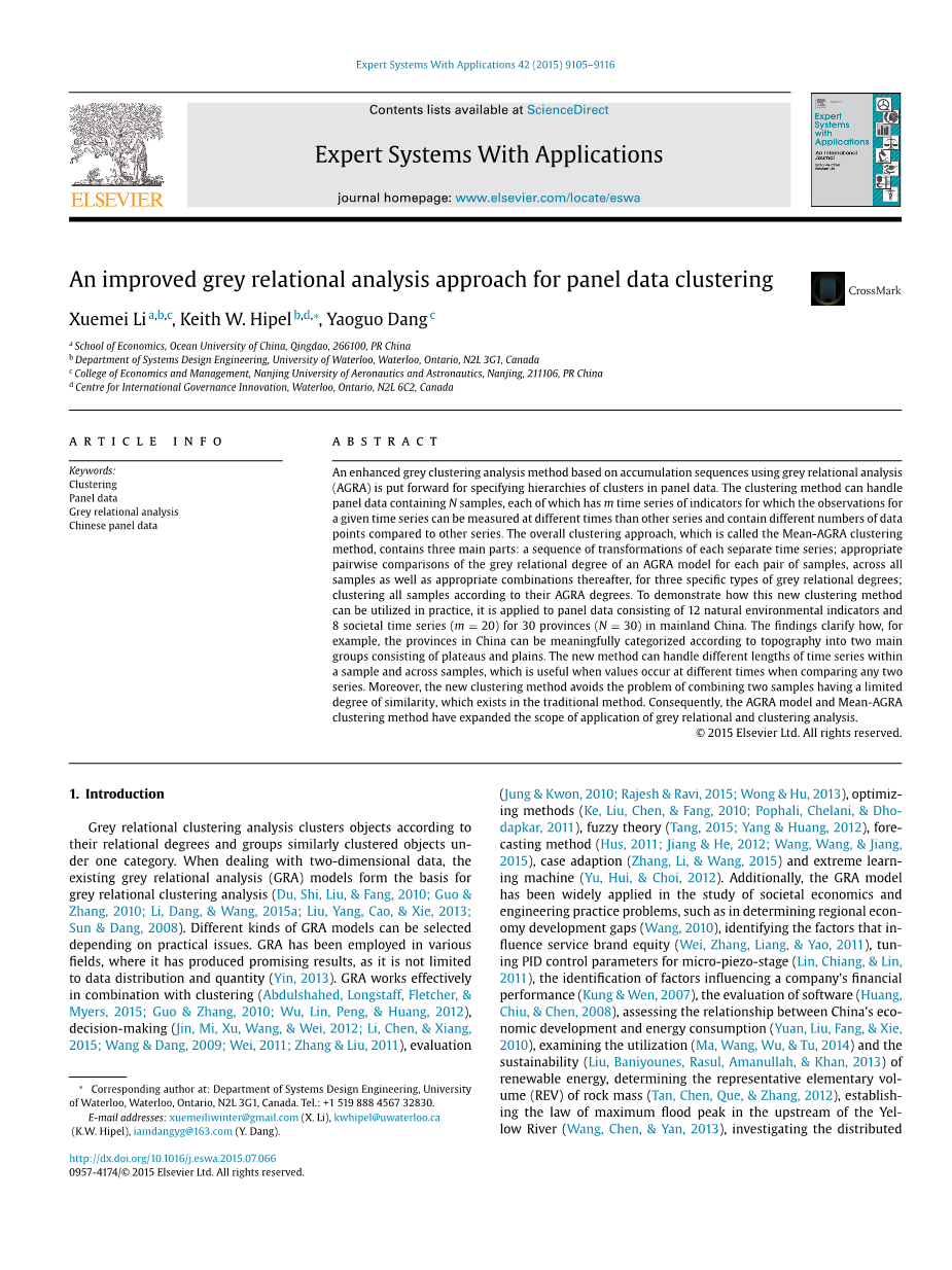 面板数据的灰色关联聚类分析需要处理两个问题。其中一个问题就是为面板数据开发一个GRA模型,并进行一些研究。 Zhang和Liu讨论了三维空间几何特征的相似性,为面板数据的灰色关联聚类分析提供了新的思路。Wu和Liu用Hessian矩阵定义了凸度,根据凸度对样本之间的相似度进行了表征,并基于凸度的灰关联分析提出了面板数据的灰关联聚类分析。Qian,Wang和Dang提供了一个灰色矩阵关系分析模型来确定样本的聚类。Liu,Dang,Qian,Zhou根据面板数据的几何特征提出了灰色网格关系模型。Li,Dang和Wan对面板数据进行了灰色关联模型分析。