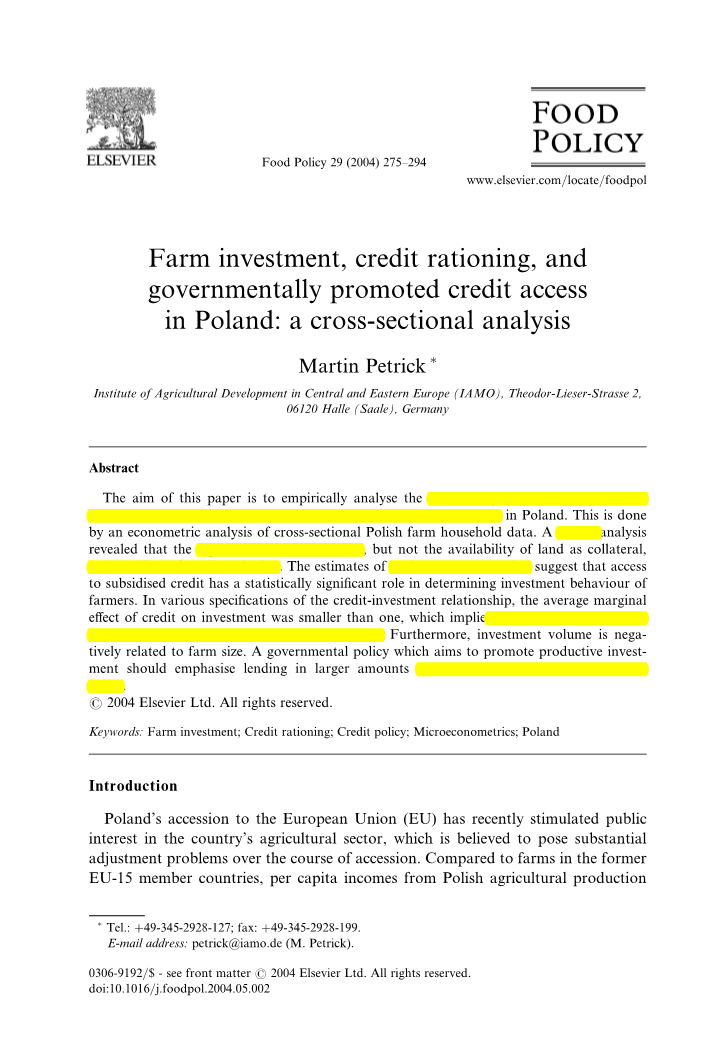关键词:农业投资; 信贷配给; 信贷政策;微观计量经济学; 波兰