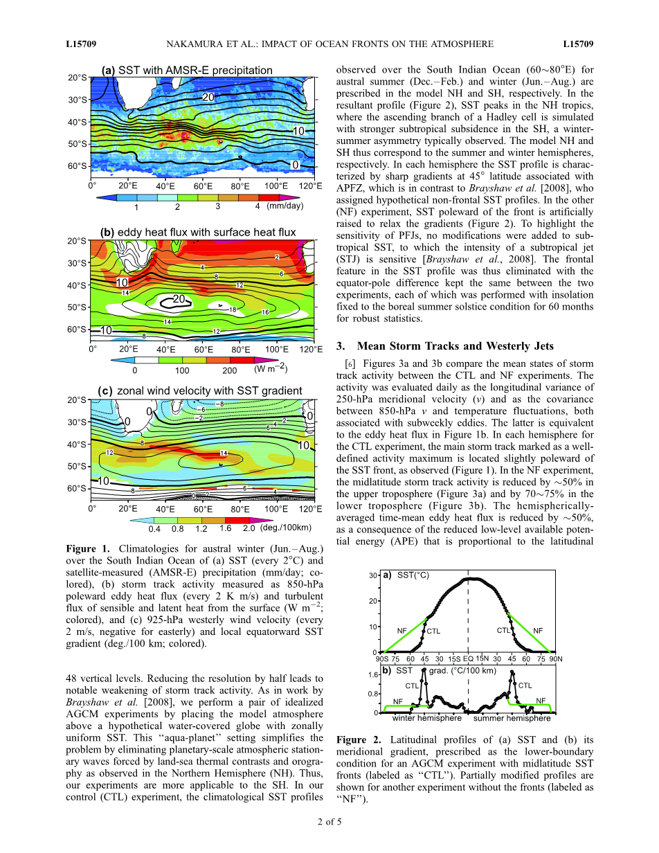 尽管除了赤道温差之外,热带大气环流的概念模型没有特别关注表面热条件,中纬度风暴已经被认为是与黑潮相关的SST锋面和与墨西哥湾流相关的SST锋面迅速向亚洲东海岸和北美迅速扩张的预告。事实上,最近的观察结果表明,主要的风暴轴和随之而来的极锋喷流都是沿着主要的海洋锋或者在海洋锋的下方。图1展示了南印度洋的典型例子,南印度洋有一个明显的海洋锋,被称为南极锋区,它形成于南纬45度附近的南极绕极流的较暖一侧,在卫星探测上表现为SST梯度很大的区域。图1中大气再分析的气候学领域和卫星数据表明,南半球的风暴轴的核心,它是降水区域最大值和每周一次的扰动导致的极向热涌来标记的,沿着SST锋面锚定,这与循环天气分析相一致。风暴轴中心与表面西风急流共同驱使着南极绕极流。