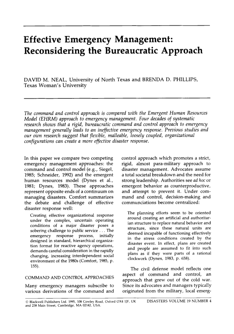 官僚规范模型认为,由于标准官僚规范或程序与灾难发生后出现的新规范之间存在差距,因此发生了不良反应。紧急规范被认为是不适应的,导致负面后果。总体而言,指挥和控制方法包含三个基本点。他们敦促严格使用官僚结构和规则,认为临时的努力导致失败的应急反应,并建议只有通过正常的、理性的、书面的官僚程序才能产生有效的应急反应。