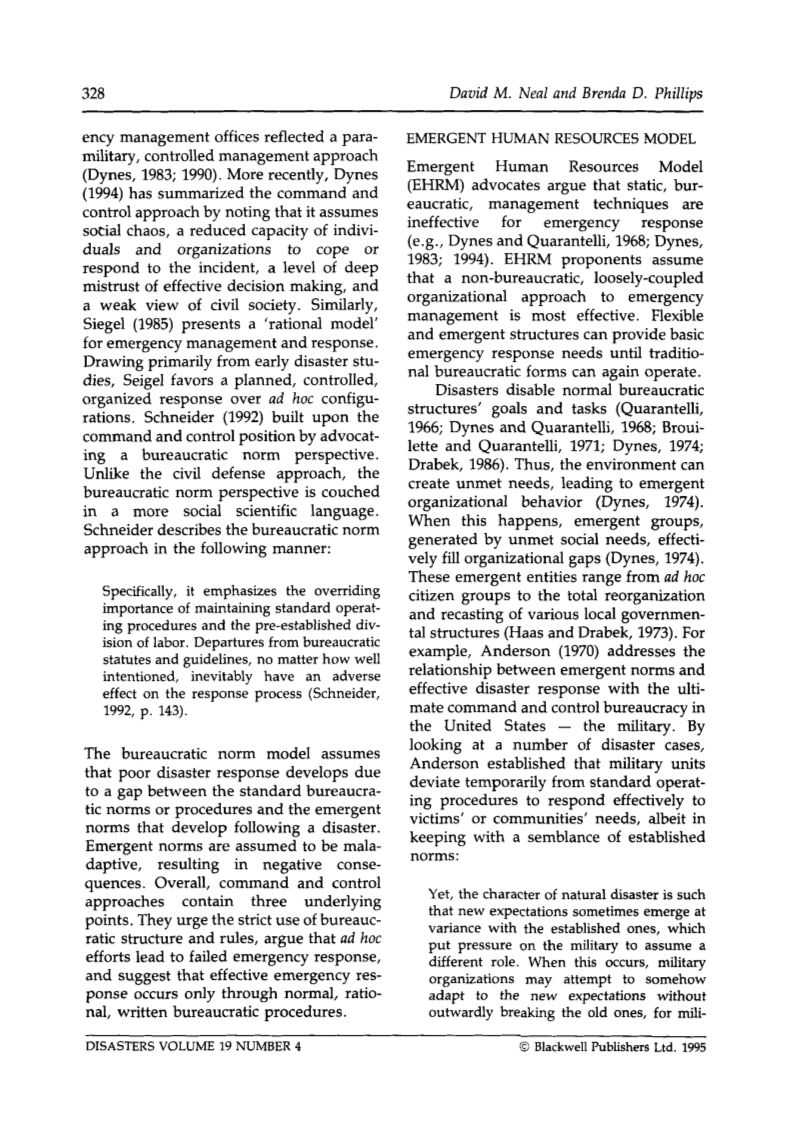 灾难破坏了正常的官僚结构的目标和任务(Qualangeli,1966;Dyes和QalangeLi,1968;Broueleta和QalangeLi,1971;DyNes,1974;Drabek,1986)。因此,环境可以创造未满足的需求,导致紧急的组织行为(DYNES,1974)。当这种情况发生时,由未满足的社会需求所产生的紧急群体有效地填补了组织差距(Dyes,1974)。这些新兴实体的范围从特设公民群体到整体重组和重铸的各种地方政府结构((Haas and Drabek,1973)。例如,乔林(1970)解决了紧急规范和有效的灾难应对之间的关系,最终的指挥和控制官僚主义在美国-军事。通过查看一些灾难案例,乔林确立了军事单位暂时偏离标准操作程序,以有效地响应受害者或社区的需要,尽管符合既定规范的外表:然而,自然灾害的特点是,新的期望有时会与既定的目标产生矛盾,这就迫使军方承担起不同的角色。当这种情况发生时,军事组织可能试图以某种方式适应新的期望,而不必向外打破旧的预期,因为军事当局认识到一旦紧急事件结束,他们的表现可以通过先前确立的准则来判断,而不是自发的紧急规范。(Anderson,1970,第421页)。