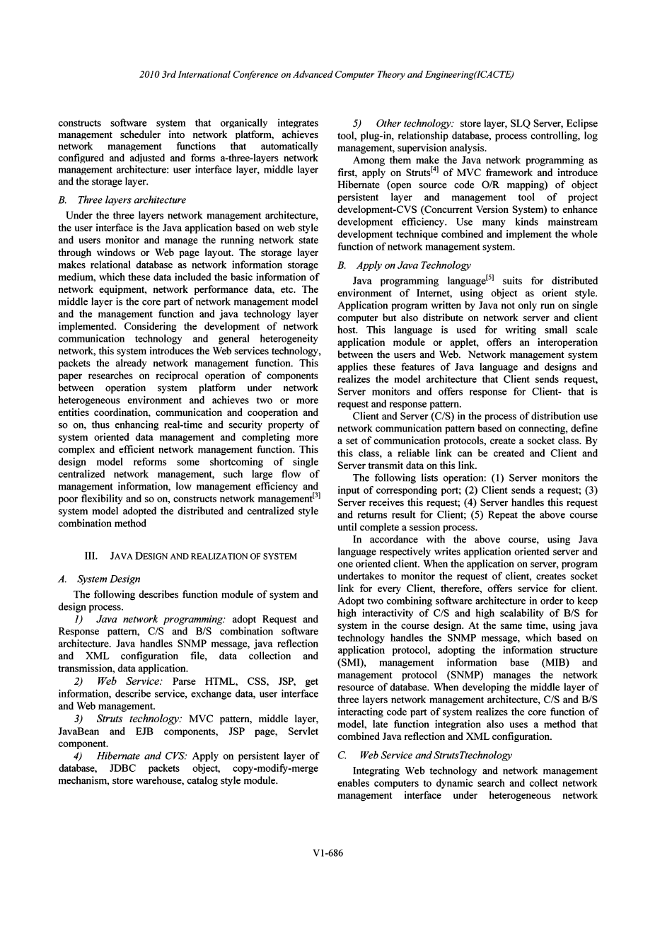 在OSI(开放系统互连)网络管理标准中,定义了五部分功能:配置管理,性能管理,故障管理,安全管理,计费管理。 Java技术改变了创建和部署应用程序的方法,为网络管理提供了新的手段。 本文以SNMP [I](简单网络管理协议,SNMP)为基础,设计并实现了一种应用于Java语言的高效,高可用性的网络管理系统。