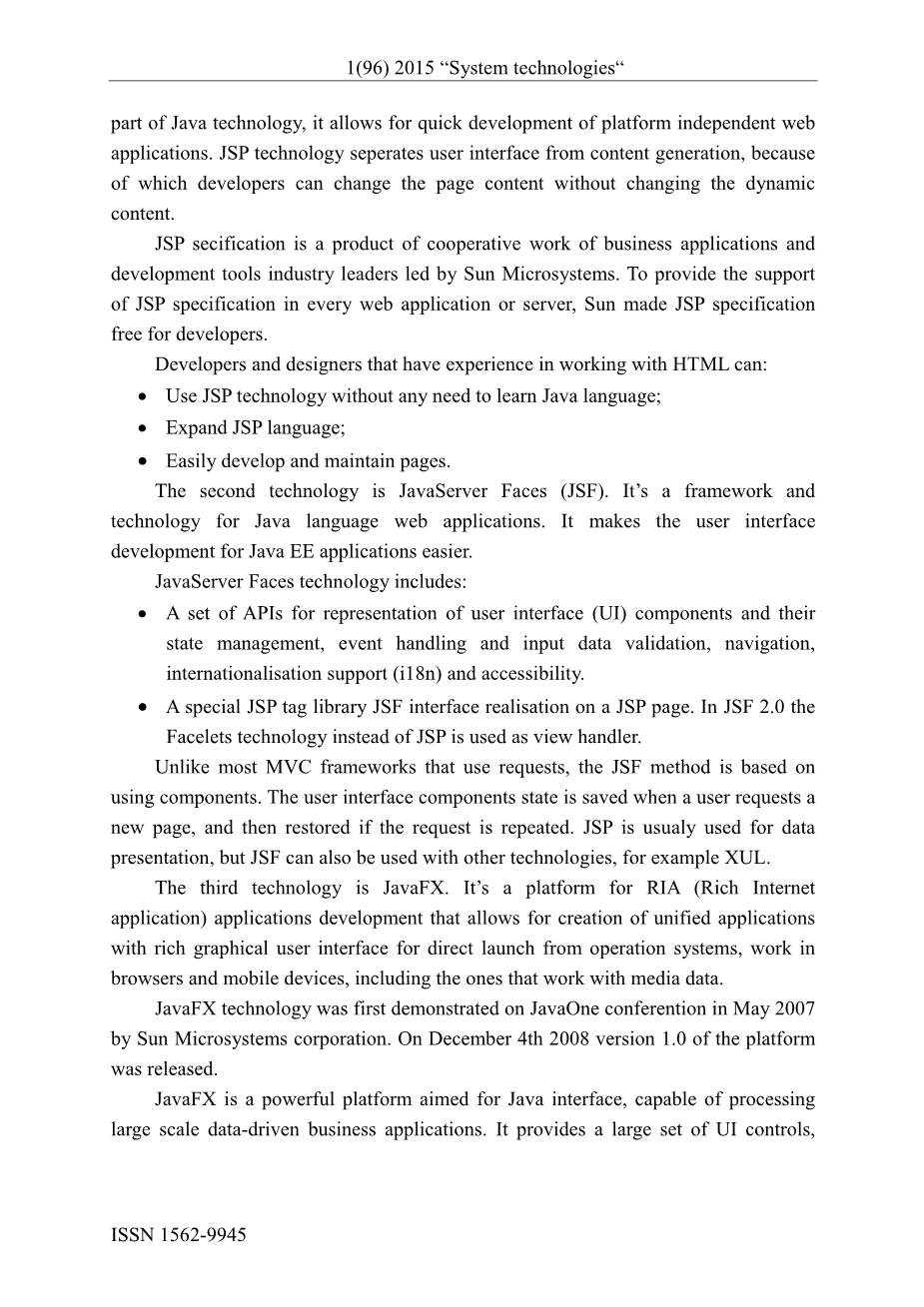 注解:本文对Java平台上的Web应用程序开发的现代技术(Java Server Pages,Java Server Faces,JavaFX,Apache Struts和Spring Framework)进行了比较分析。提供了这些技术的特点和关于它们可能的使用领域的结论。