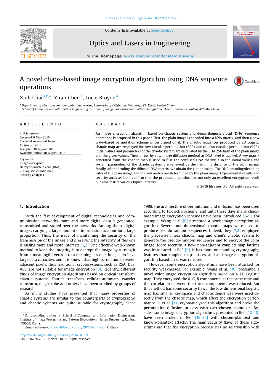 但是,一些加密算法已经因安全性弱而受到攻击。例如,Wang等人 [10]提出了一种基于一维Logistic映射的新型彩色图像加密算法。 他们同时加密了R,G,B分量,并减少了三个分量之间的相关性。但这种方法存在一些安全缺陷:低维Logistic映射关键空间较小,直接从混沌映射中使用混沌序列,影响加密性能。Li等人 [11]加密分析这个算法,并打破了两个选择明文的置换扩散过程。此外,一些参考文献[12–18]中的图像加密算法在参考文献[19–25] 中被选择明文攻击和已知明文打破了。这些算法的主要安全缺陷是加密过程与普通图像没有关系,并且对于不同的原始图像采用相同的混沌序列。