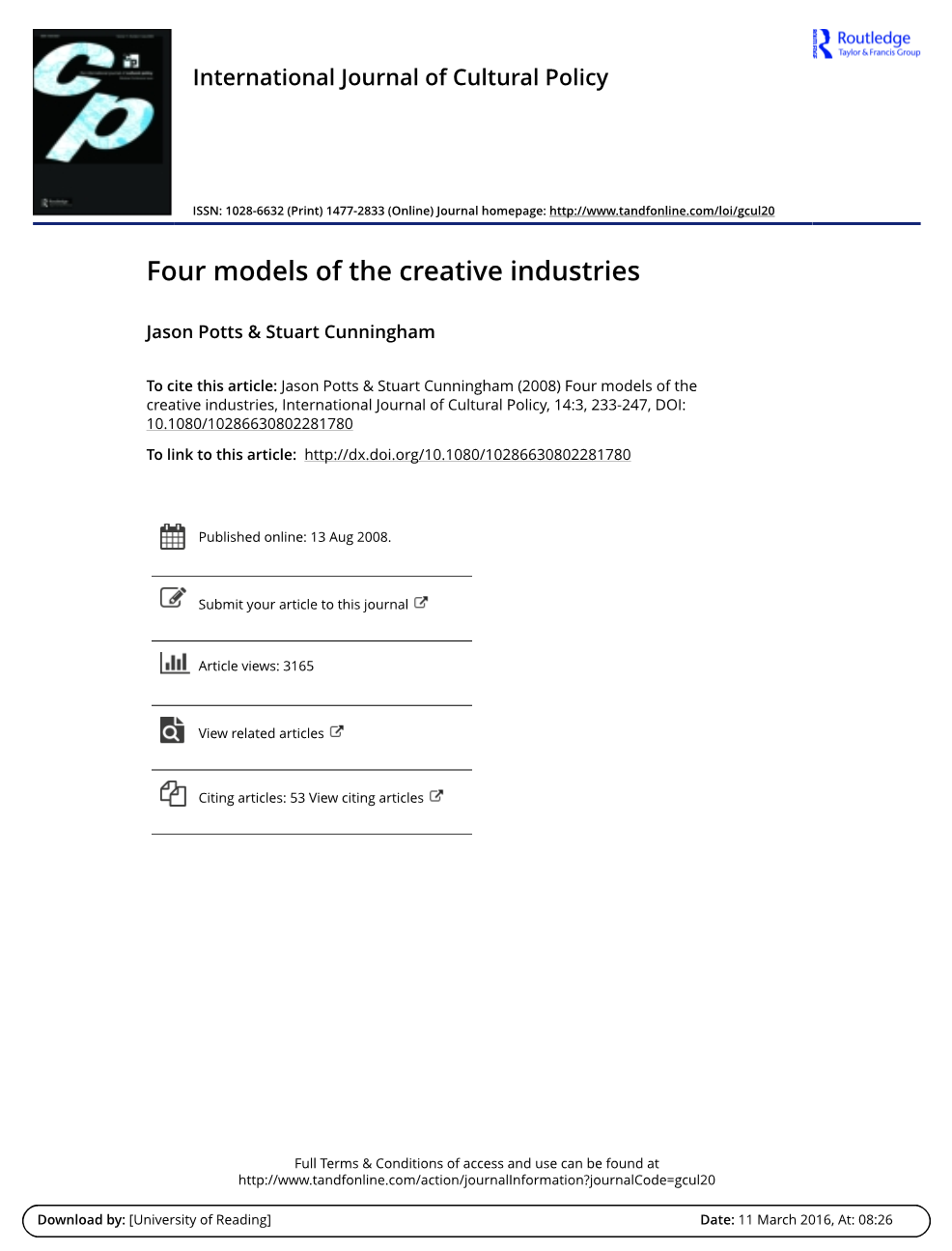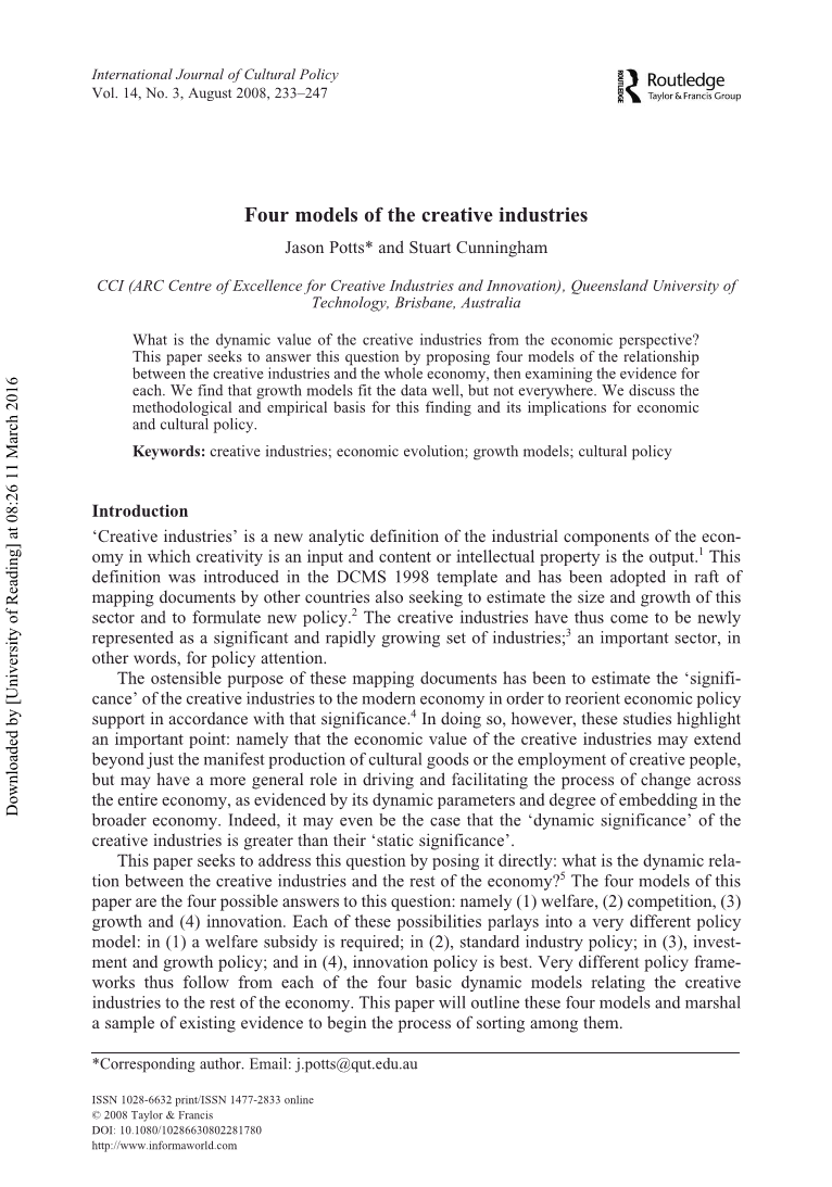 摘要:从经济角度来看,创意产业的动态价值是什么?本文试图通过提出创意产业和整个经济之间关系的四种模型来回答这个问题,然后对每个模型的证据进行验证。我们发现增长模型很好地适合数据,但并不是无处不在。 我们讨论这一发现的方法论和经验基础及其对经济和文化政策的影响。