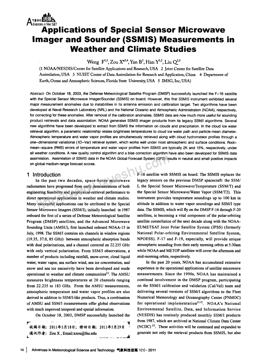 卫星专用传感器微波成像仪/探测仪SSMIS观测资料在天气和气候研究中的应用