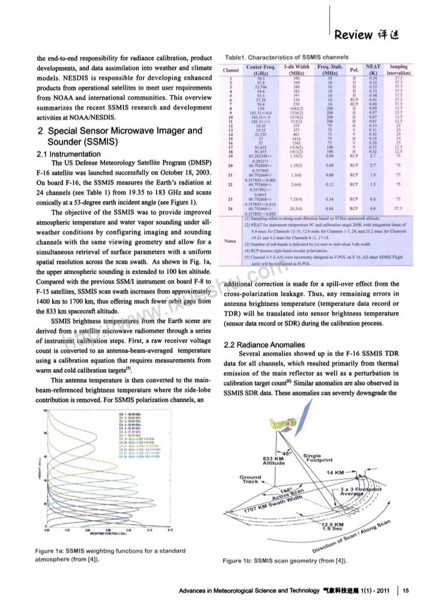美国国防气象卫星计划(DMSP)F-16卫星于2003年10月18日成功发射。在F-16号卫星上, SSMIS测量地球辐射从19.35到183 GHz的24个通道(见表1),并以53度的地球入射角采用圆锥式扫描(见图一)。