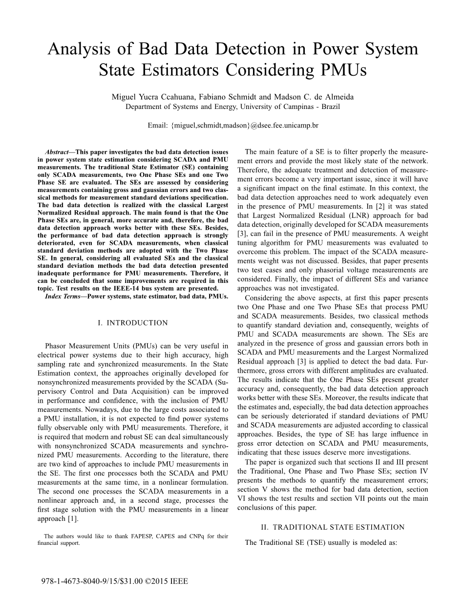 原文标题Analysis of bad data detection in power system State Estimators considering PMUs