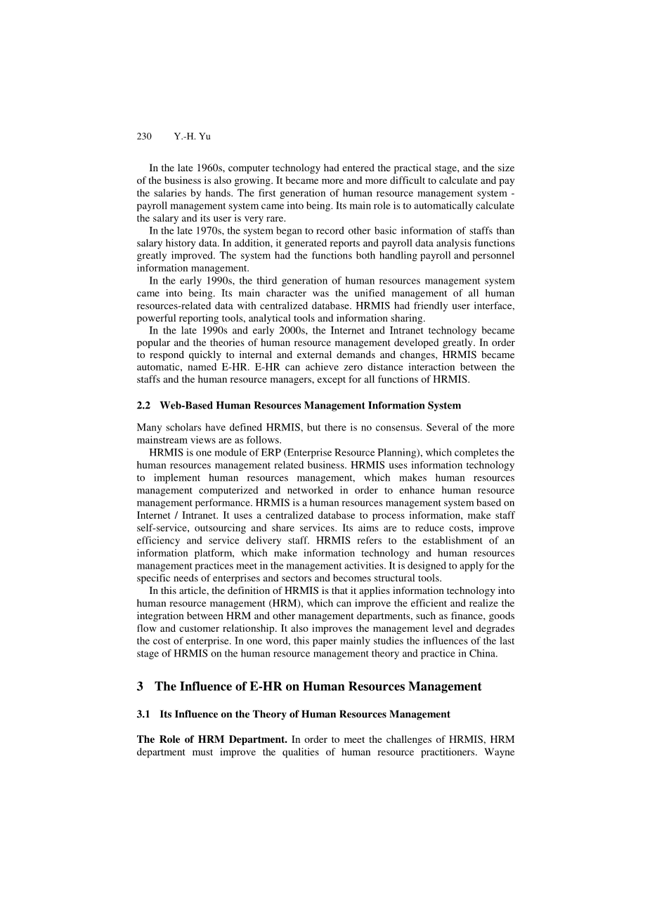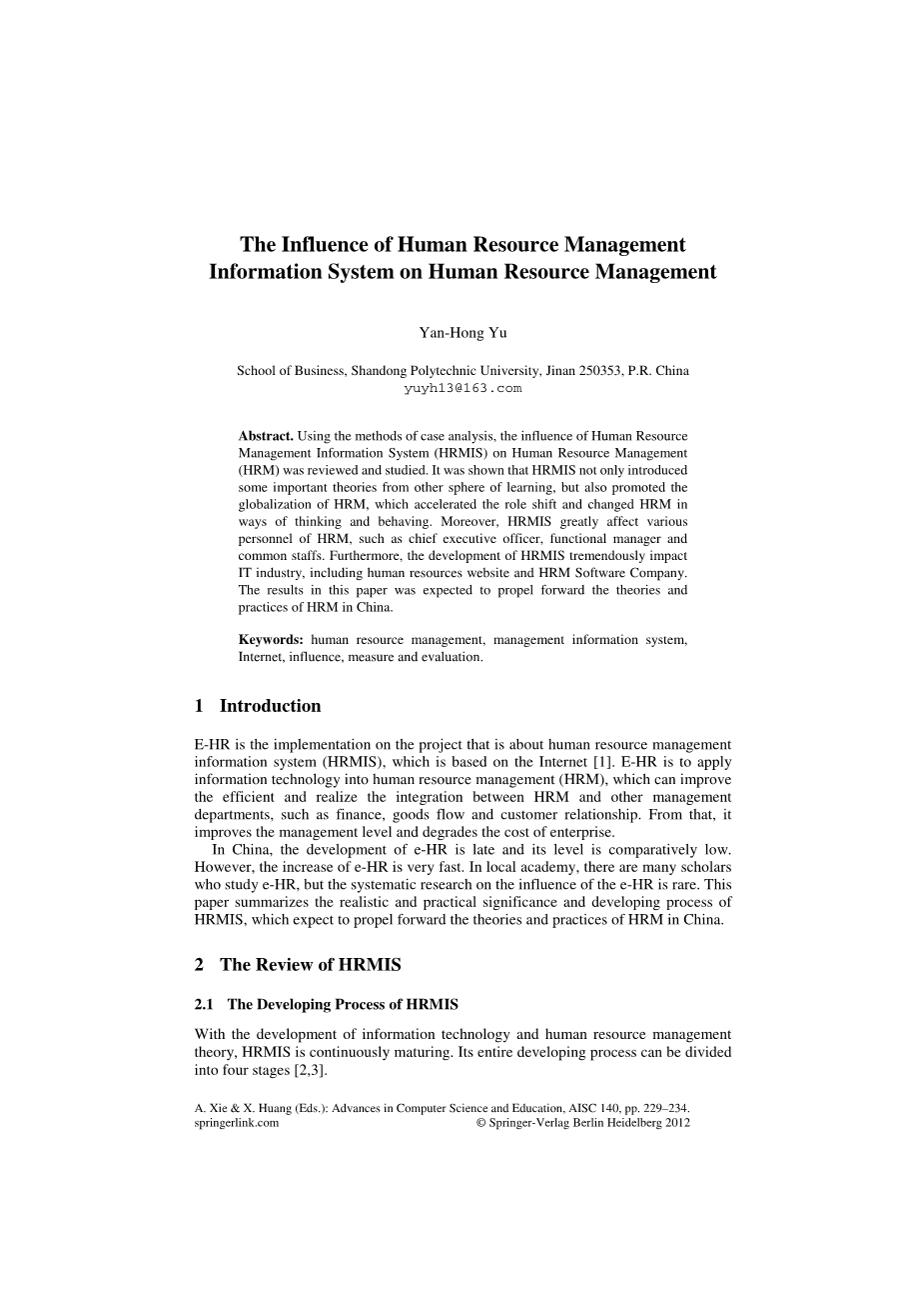 E-HR是关于基于互联网项目的实施人力资源管理信息系统(HRMIS),[1]。E-HR将信息技术应用到人力资源管理(人力资源管理),可以提高效率,实现人力资源管理之间的集成和其他管理部门,如金融、商品流和客户关系。从这一点上,它提高了管理水平,降低了企业的成本。在中国,电子人力资源开发的发展滞后,其水平相对较低。然而,电子人力资源的增长速度非常快。在地方学院有许多学者研究电子人力资源,但对电子人力资源影响的系统研究却很少。综述HRMIS的现实和实践意义和发展过程,它希望向前推动中国人力资源管理的理论和实践。