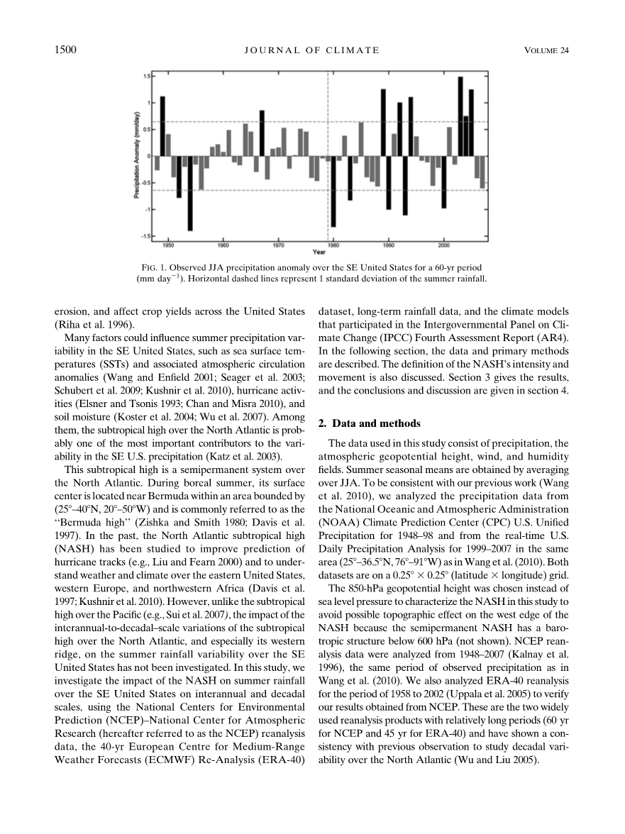 这个副热带高压是北大西洋的半永久系统。在北方夏季,其表面中心位于百慕大附近(25°-40°N,20°-50°W)的范围内,通常被称为“百慕大高压”。在过去,已经研究了北大西洋副热带高压(NASH)以改进对飓风轨迹的预测,并且用以了解美国东部,西欧和西北非的天气和气候。然而,不同于太平洋上的副热带高压,北大西洋副热带高压,特别是其西高压脊的年际到年代际尺度变化对美国东南部的夏季降水变化的影响还没有研究。在本研究中,我们使用国家环境预测中心(NCEP) - 国家大气研究中心(以下简称NCEP)再分析资料,欧洲中期天气预报中心(ECMWF)40年再分析(ERA-40)数据集,长期降水资料和参与政府间气候变化专门委员会(IPCC)的气候模式第四次评估报告(AR4),来研究NASH对美国东南部夏季降水在年际和年代际尺度上的影响。在下一节中,描述了资料和主要方法,还讨论了NASH的强度和运动的定义。第3节给出了结果,结论和讨论在第4节中给出。