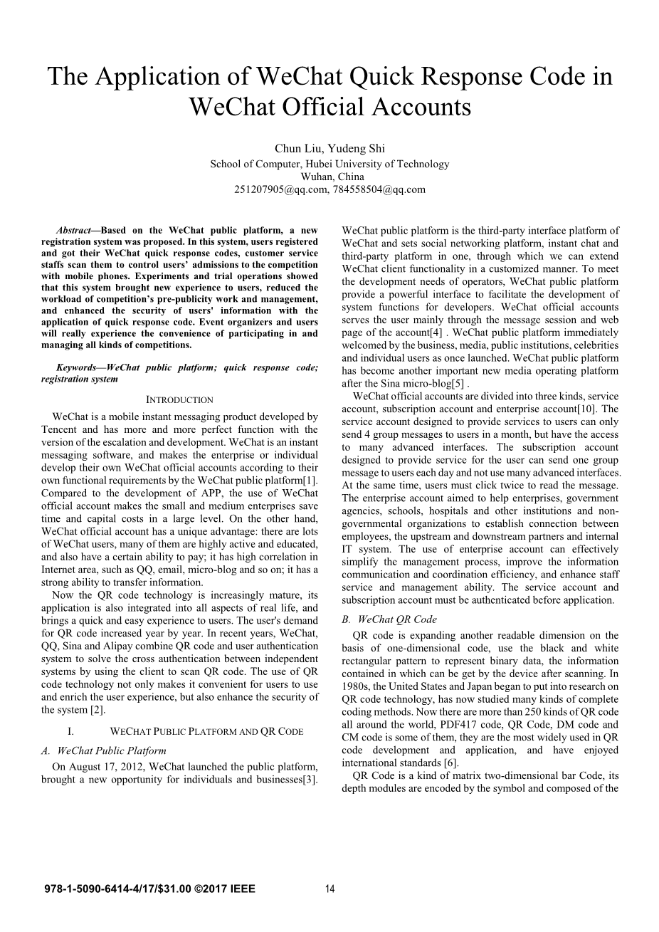 关键词:微信公共平台; 快速响应代码; 登记系统