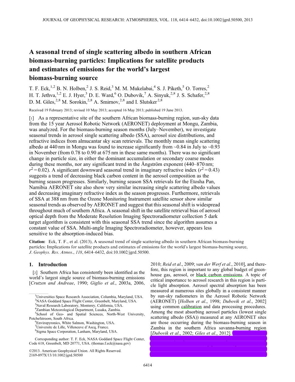 南部非洲一直被认为是世界上最大的单一生物质燃烧排放源。因此,这个区域的温室气体、气溶胶或黑碳排放对于任何全球规划都很重要。这一地区气溶胶研究的一个重要课题是粒子光吸收。AERONET站点通过太阳天空辐射计并使用常见的校准和数据处理程序的方法测量全球范围内气溶胶吸收光谱。在任何AERONET测量站点吸收最多的气溶胶粒子(最低的单散射反照率(SSA))是发生在非洲南部的热带稀树草原燃烧区赞比亚生物质燃烧季节。这是由于在稀树草原环境中的草燃烧过程中发生的燃烧与闷烧燃烧的相对较高的比例,与其他一些环境中木质燃料闷烧燃烧的较大比例相比,如在沃德等人控制的烧伤中原位测量的结果。