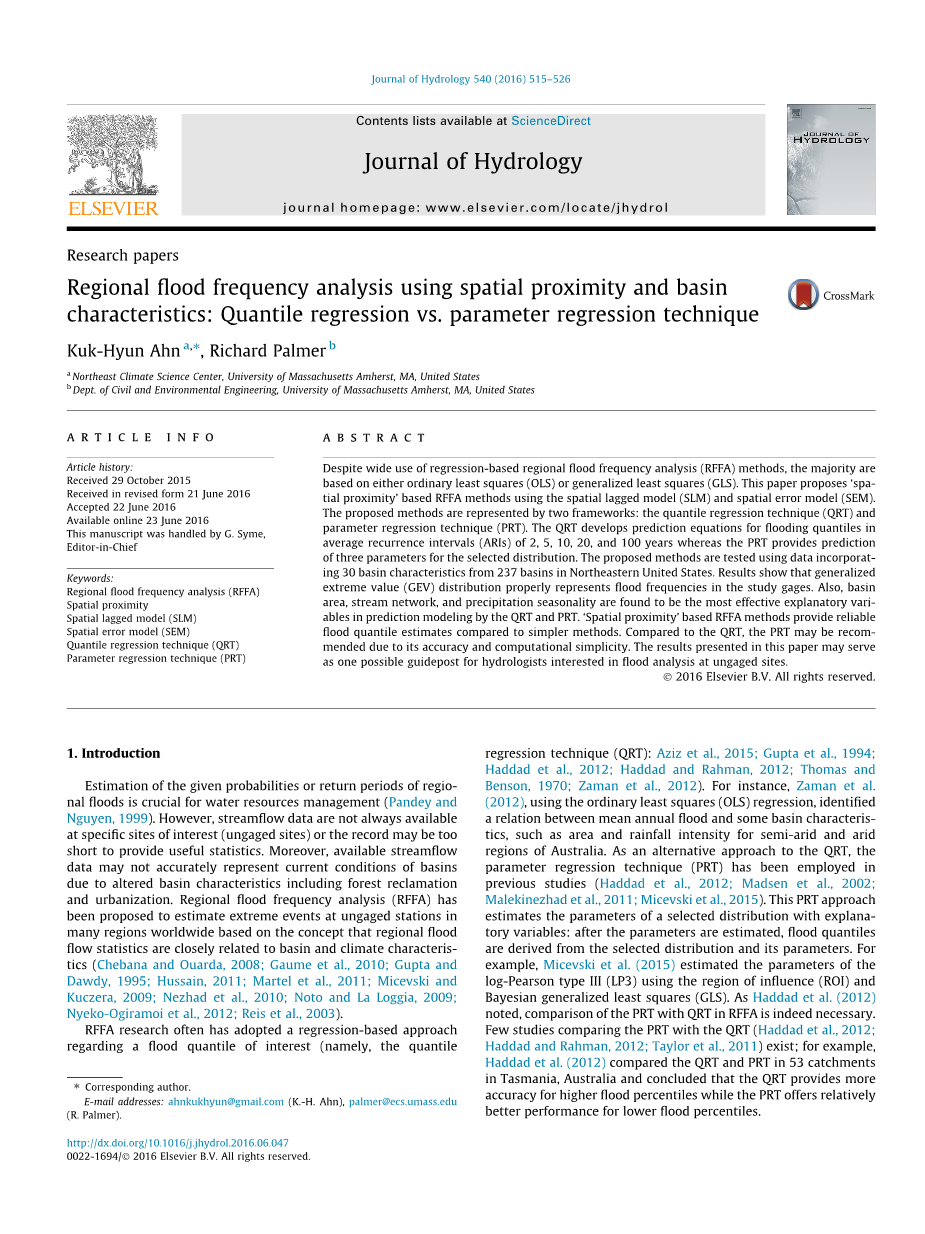 摘要:尽管现在已经广泛使用基于回归的区域频率分析(RFFA)方法,但大多数还是基于普通最小二乘法(OLS)或广义最小二乘法(GLS)。而本文提出“使用空间滞后模型(SLM)和空间误差模型(SEM)进行基于距离的RFFA方法。所提出的方法由两个框架表示:分位数回归技术(QRT)和参数回归技术(PRT)。 QRT开发预测方程平均复发间隔(ARIs)为2,5,10,20和100年,而PRT提供预测所选分布的三个参数。所提出的方法使用数据来自美国东北部237个盆地的30个盆地特征。结果表明,广义极值(GEV)分布能正确地表示研究量规中的频率。另外,在盆地区域,栅格化径流和降水季节性被认为是最有效的解释变量,通过QRT和PRT进行预测建模。 “空间邻近性”的RFFA方法提供可靠的与更简单的方法相比,分数量估计值。与QRT相比,PRT可能是推荐的,由于其准确性和计算简便性而修补。本文提出的结果可能会起作为一个可能的指导方针作用,对于在非目标地点进行流域分析感兴趣的水文学家。
