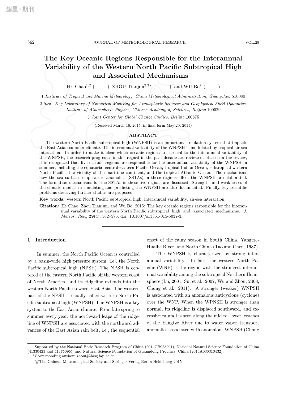 摘要:西太副高(WNPSH)是影响东亚夏季气候的重要环流系统,热带海气相互作用影响着西太副高的年际变化率。为弄清楚哪些海区对西太副高年际变率的影响至关重要,本文对过去十年中的相关研究进展进行了回顾,总结出影响夏季西太副高的五个关键海洋区域,包括赤道中东太平洋、热带印度洋、副热带西北太平洋、海洋大陆附近海区和热带大西洋。阐述了这些区域中海表温度异常(SSTA)影响西太副高的机制,讨论了这五个地区海温异常的形成机制,回顾了当前气候模式的模拟和预测研究的现状。 最后,提出了需要进一步研究的关键科学问题。