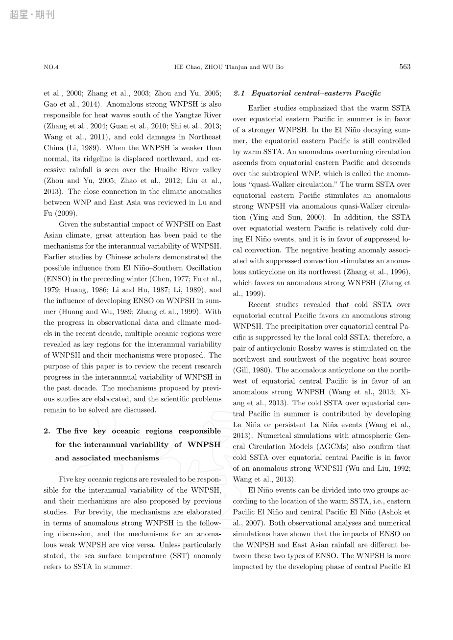 根据正海温异常的位置可以将厄尔尼诺划分为两种,即东太平洋厄尔尼诺和中太平洋厄尔尼诺。观测分析和数值模拟都表明两种ENSO事件对西太副高和东亚降水的影响是不同的。中太平洋厄尔尼诺事件对西太副高的影响比东太平洋厄尔尼诺事件的影响更强。在厄尔尼诺衰减年夏季,东太平洋厄尔尼诺事件对西太副高的影响比中太平洋厄尔尼诺事件的影响更强。中太平洋拉尼娜和东太平洋厄尔尼诺事件都有利于副热带西北太平洋出现异常反气旋;在中太平洋厄尔尼诺期间,中国南方将会产生大量降水,然而在东太平洋拉尼娜事件期间却没有太多降水异常。Zhou等总结了关于两类ENSO事件对东亚-西北太平洋气候的影响。