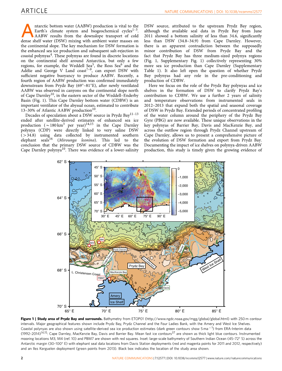 全球第四重要的南极底层水的产生区域已被归因于位于东南极普里兹湾附近的冰间湖的高密度的底层水形成的。这里,我们展示了2011-2013年来自CTD仪器表象海豹的新观测资料,提供了对普里兹湾高密度陆架水形成的首次完整的评估。经过一次复杂的演变,涉及三个冰间湖(正极)和两个冰架(负)的相对贡献,高密度的底层水(盐度34.65-34.7)通过普里兹湾通道输出。这是对达恩利角底层水的一个特殊的,相对较新的贡献。在其他地方,高密度底层水形成受到来自埃莫里冰架和西冰架输入到普里兹湾环流的淡水的阻碍。这项研究显示,南极底层水对从冰架上输入的淡水的敏感性,并最终因南极地层水而对气候造成崩溃的可能性。