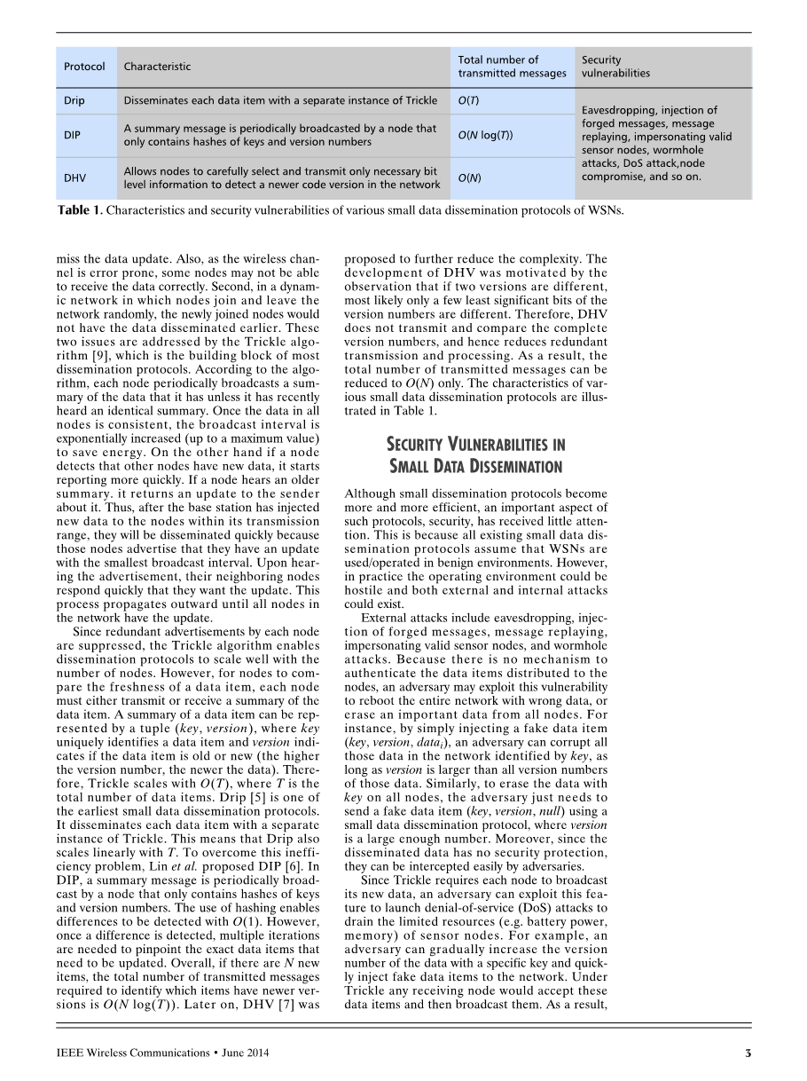 最近已经提出了几种小数据传播协议。其中,Drip [5],DIP [6]和DHV [7]通常被认为是最先进的技术,并且包含在TinyOS分布[8]中。但是,所有这些小型数据传播协议的重点在于如何提高操作的效率和可靠性,但不考虑任何安全方面。另一方面,许多安全代码传播协议已经被开发出来;读者可以参考[3]并了解其中的更多信息。