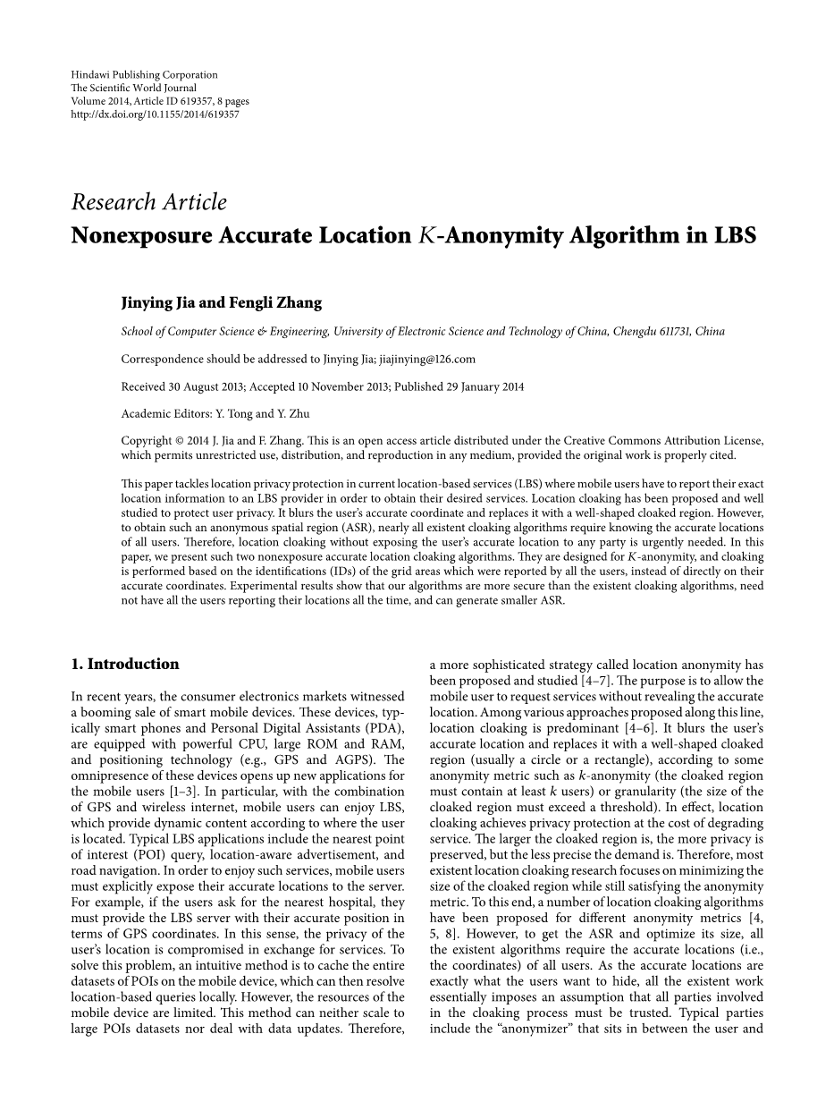 近年来,电子消费市场见证了智能移动设备的蓬勃发展。这些设备,通常是智能手机和个人数字助理(PDA),配备强大的CPU,大型ROM和RAM,和定位技术(例如,GPS和AGPS)。这些设备无所不在地为移动用户开发新的应用。尤其通过GPS和无线互联网的结合,移动用户可以享受到一种LBS服务,这种服务根据用户所在位置提供动态内容。典型的LBS应用包括最近的兴趣点(POI)查询,位置感知广告和道路导航。为了享受这样的服务,移动用户必须明确地将其准确的位置暴露给服务器。例如,如果用户询问最近的医院,他们必须提供给LBS服务器GPS坐标的准确位置。在这个意义上,用户以位置隐私受到损害的代价换取服务。为了解决这个问题,直观的方法是在移动设备上缓存POI的整个数据集,然后可以在本地解决基于位置的查询。然而,移动设备的资源是有限的。这种方法既不能扩展到大型POI数据集也不能处理数据更新。因此,有人已经提出并研究了一种更为复杂的策略,这种策略称作位置匿名。其目的是允许移动用户在不显示准确位置的前提下请求服务。在沿线提出的各种方法中,位置隐藏是主要的。它根据一些像k-匿名(隐藏区域必须至少包含k个用户)或粒度(隐藏区域的大小必须超过阈值)的匿名度量,模糊了用户的准确位置,并且用一个形状规整的隐藏地区(通常是一个圆形或矩形)替换用户的准确位置。实际上,位置隐藏以牺牲服务为代价实现隐私保护。随着隐藏区域越大,隐私越多越多地保存,但需求的精确性越来越低。因此,大部分现有的位置隐藏研究集中在最小化隐藏区域的大小,同时仍然满足匿名度量。为此,一些位置隐藏算法已经提出了不同的匿名度量标准。但是,要获得ASR并优化其大小,现有算法需要所有用户的精确位置(即坐标)。由于准确的位置正是用户想要隐藏的位置,所有现有的工作本质上都假设参与隐藏过程的所有各方都必须被信任。典型的组织包括位于用户和LBS服务器之间的“匿名者”。然而,实际上,这些组织中的任何一方都可能是恶意的,并且将准确的位置信息暴露给任何一方可能会泄露用户身份或其他敏感信息。在这个意义上,现有的算法应用有限,而且不会将准确的用户位置暴露给任何一方的位置隐藏是迫切需要的。