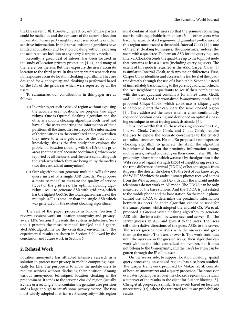 本文的其余部分进行如下。第二部分讨论LBS中关于位置匿名和隐私保护的现有研究。第三部分介绍了系统架构。第四部分介绍了针对QoS的度量模型和两种在集中式环境生成ASR的算法。实验结果见第五部分,结论和未来工作在第六部分。