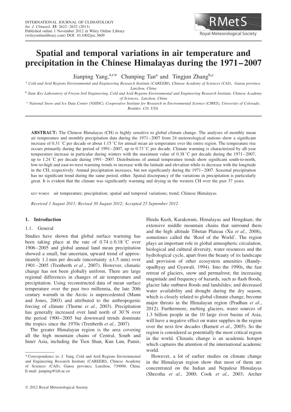 在CH区,Xu等(2008)指出了1961 - 2001年间日照时间,平均空气温度,蒸发量(phi;20)和降水量的空间变化。张(1997)发现,二十世纪六十年代气温平均气温最低,是二十世纪八十年代最高的一年,一九六一至九○年代不同季节气温普遍升高。杜等人(2000年,2004年)和杜(2001年)报告,从1952年到1995年,每十年增加了0.065◦C,年平均气温在1961 - 2000年间为每十年0.26◦C,大多数年降雨量呈上升趋势CH部分,但西部CH明显下降。尚等(2006)报道,每十年平均气温每年上升0.27◦C,而西部CH地区年平均降水量从1961年到2000年均有变动趋势。Bian和Du(2006)也报道了年温度降水量年均增长率为每十年0.24℃,年平均气温为9.6℃,年降水量为9.6mmy-1。表1总结了早期研究报告的喜马拉雅山不同地区温度变化的结果。