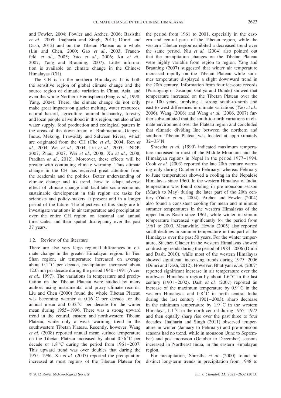 然而,很多早期关于喜马拉雅地区气候变化的研究表明,它们大部分集中在印度和尼泊尔喜马拉雅山(Shrestha等,2000; Cook et al。,2003; Archer和福勒,2004; Fowler和Archer,2006; Basistha et al。,2009; Jhajharia和Singh,2011年; 2012年)和青藏高原(Liu and Chen,2000; Gao et al。,2003; Frauenfeld et al。,2005; Yao et al。,2006; Xu et al。,2007 ; Yang and Brauning,2007)。 中国喜马拉雅山(CH)的气候变化信息很少。