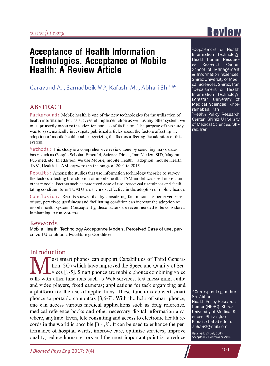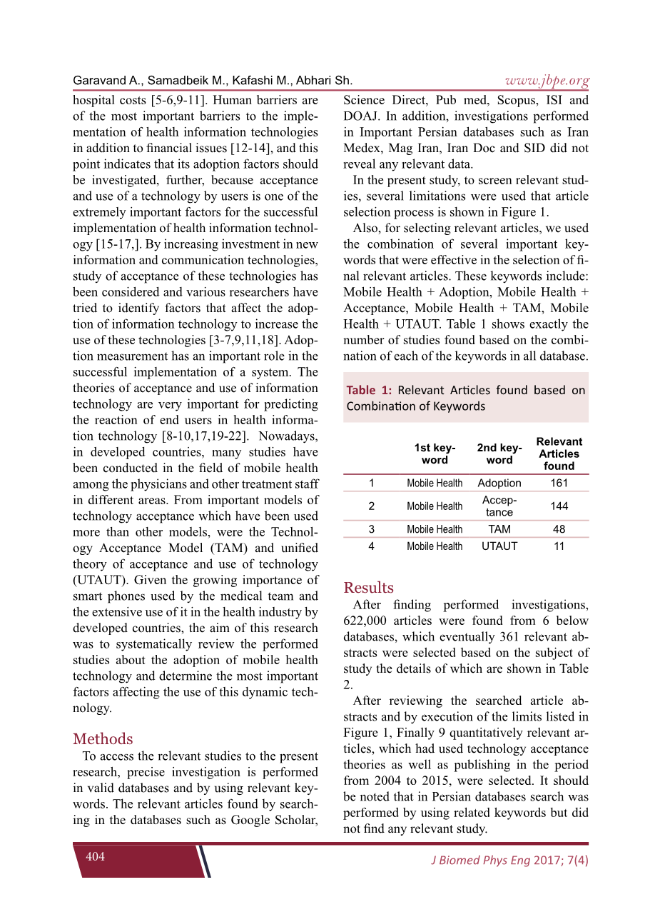 为研究选择相关的文章后,我们继续进行的调查研究,在此基础上,在不同的可用模型领域的技术验收,技术接受模型(TAM),统一理论的接受和使用的技术(UTAUT),在一个案例中创新扩散理论(DOI)被用于调查影响因素采用移动健康。