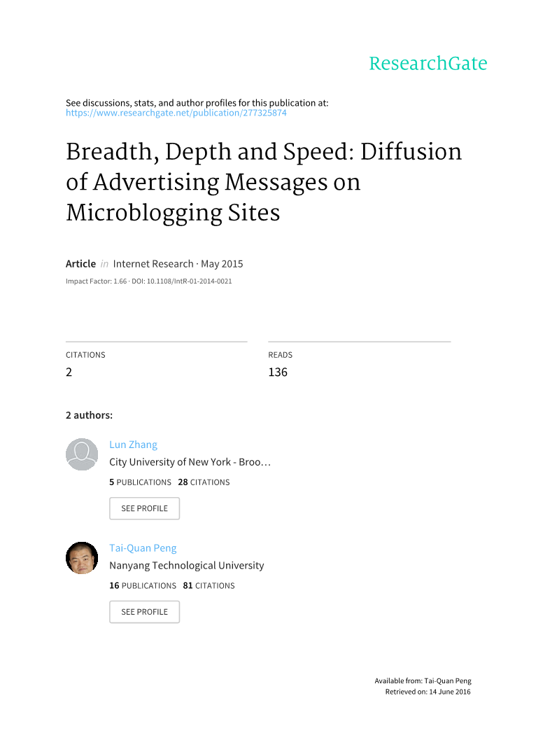 Lun Zhang,Tai-Quan Peng.Breadth,Depth and Speed:Diffusion of Advertising Messages on Microblogging[J].SitesInternet Research,2015,Vol.25(3),pp.453-470.